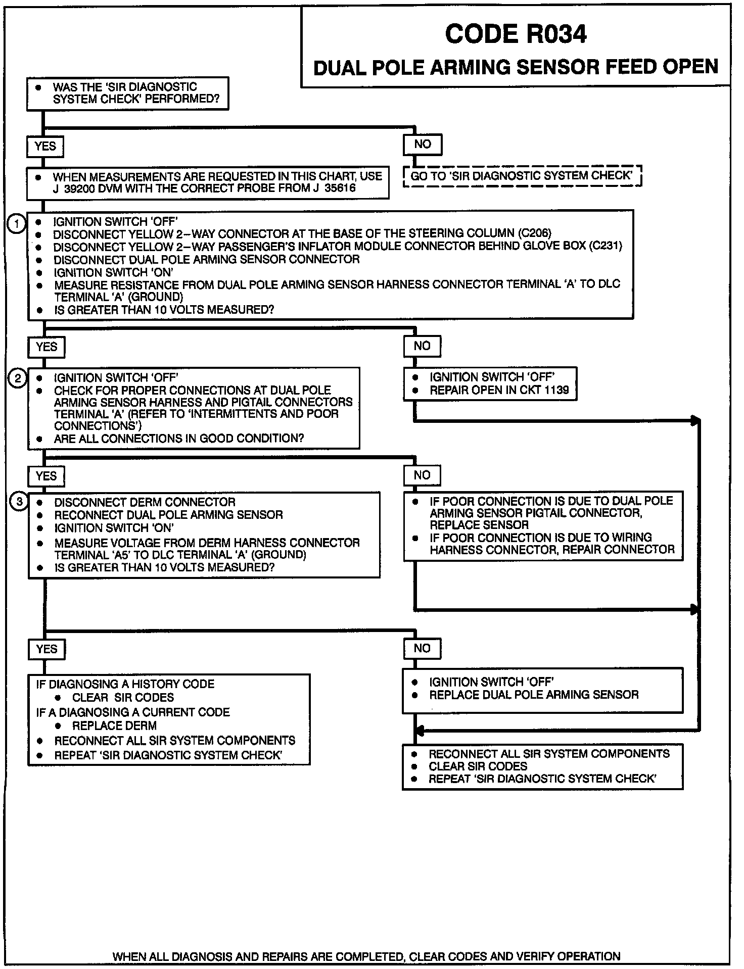 During the 'Turn-On' tests performed at the beginning of each ignition cycle, the DERM delays the charging of the 'DRIVER'S 36 VLR' and 'PASSENGER'S 36 VLR' power supplies. While the delay is active, the DERM measures the voltage at the 'DRIVER'S 36 VLR', terminal 'A4', 'PASSENGER'S 36 VLR', terminal A3', 'DRIVER'S SOURCE SENSE', terminal 'A5', and 'PASSENGER'S SOURCE SENSE', terminal A6'. When the voltage measured at the two '36 VLR' power supplies indicates they are in a discharged state (4.5 volts less than Ignition 1) and the voltage measured at each 'SOURCE SENSE' terminal is at least 3.34 volts less than Ignition 1, Code R034 is set. Code R034 indicates an open in the Ignition 1 circuit feeding the Dual Pole Arming sensor or an open internal to the Dual Pole Arming Sensor.