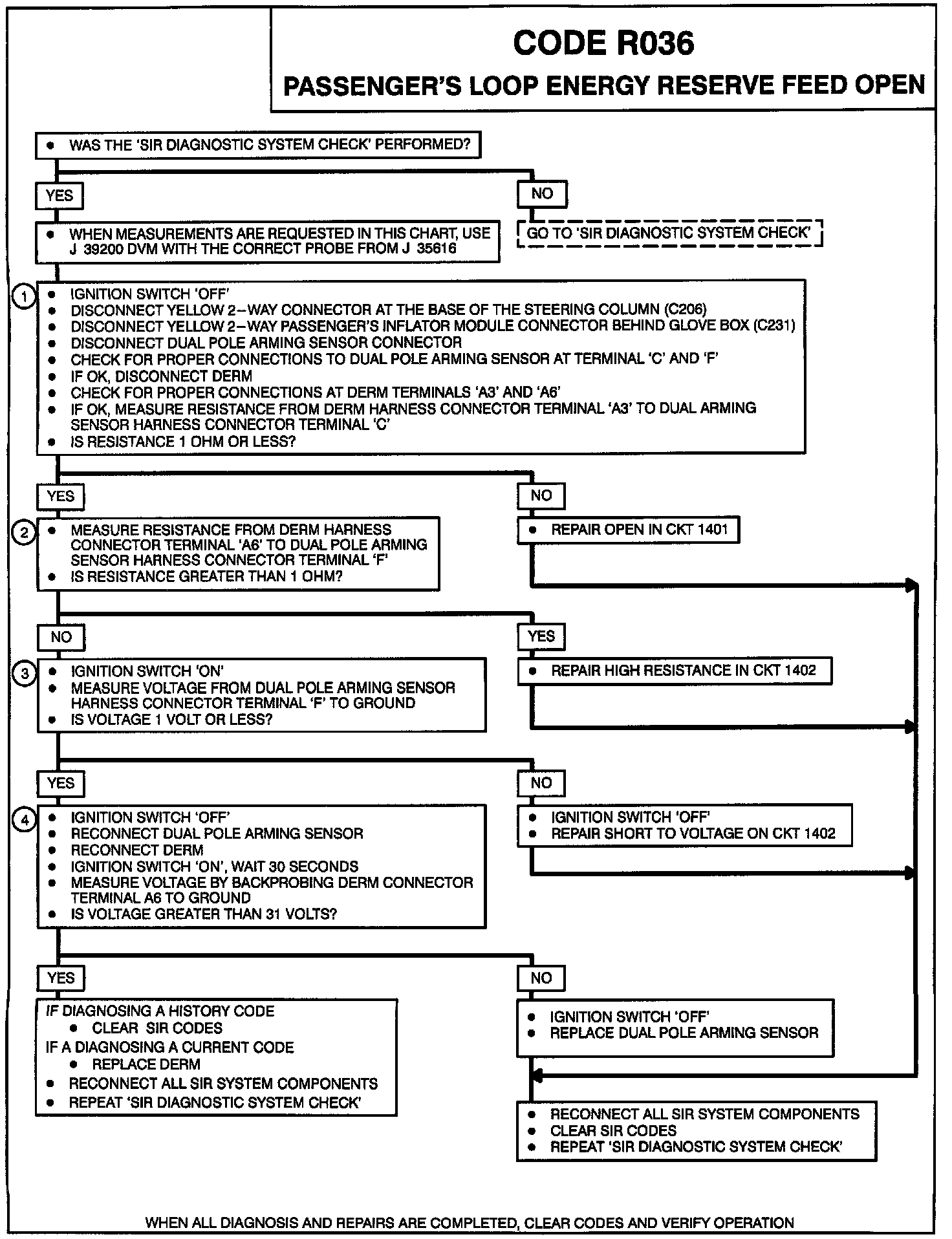 During the 'Continuous Monitoring' tests, the DERM monitors the voltage at 'PASSENGER'S SOURCE SENSE', terminal A6'. When the circuit is operating normally the measured voltage will be slightly less than 'PASSENGER'S 36 VLR'. If the 'PASSENGER'S 36 VLR' circuit opens the voltage measured at 'PASSENGER'S SOURCE SENSE' will decrease to (Ignition 1 ± 5 volts). When the voltage measured at 'PASSENGER'S SOURCE SENSE' is (Ignition 1 ± 5 volts) for 500 milliseconds, Code R036 sets.