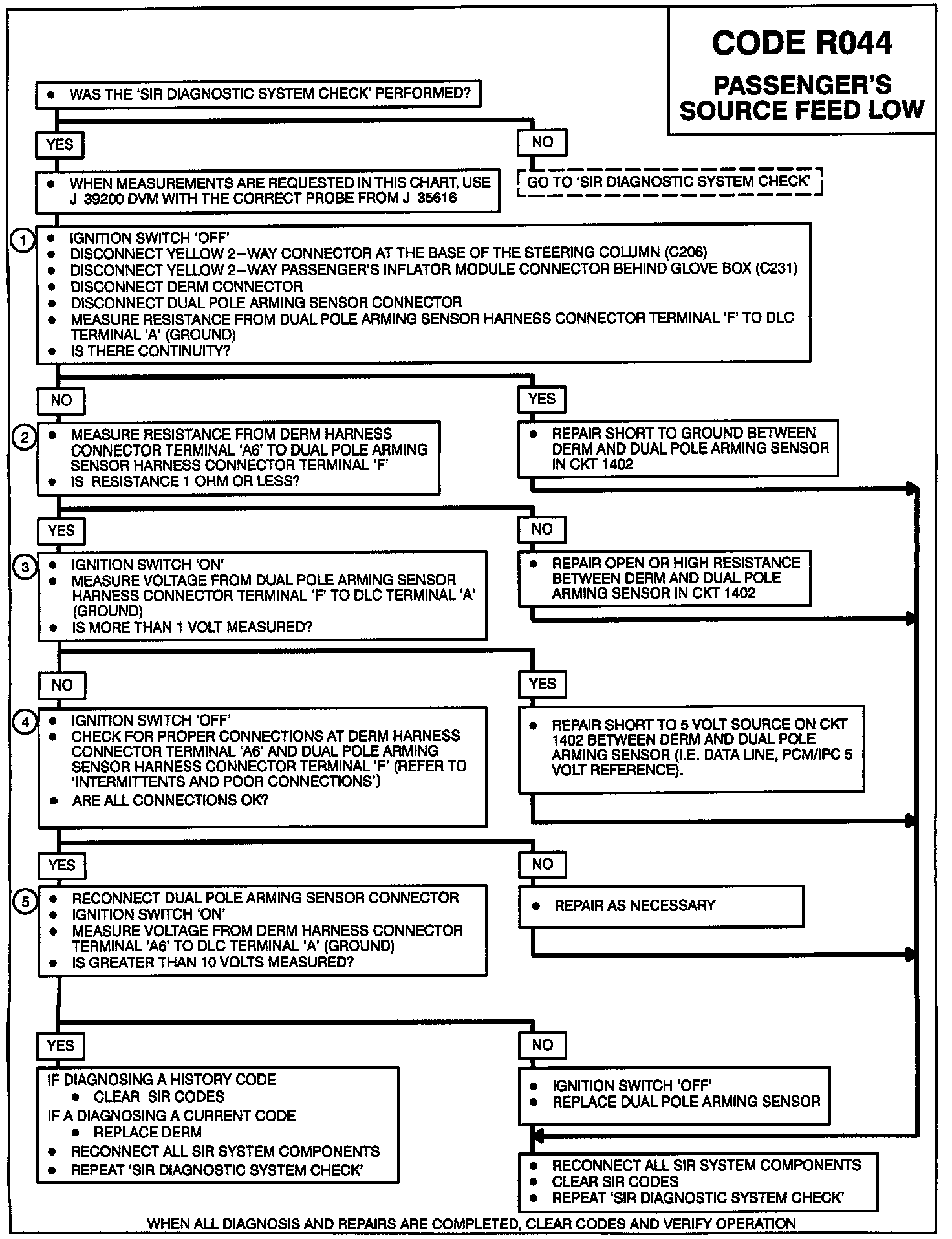 During normal non-deployment operation of the SIR system, the DERM monitors the voltage supplied through the Dual Pole Arming Sensor to the high side of the Passenger's Deployment Loop at 'PASSENGER'S SOURCE SENSE', terminal 'A6'. The normal measured 'PASSENGER'S SOURCE SENSE' voltage will be greater than ('Passenger's 36 VLR' - 6 volts). When 'PASSENGER'S SOURCE SENSE' drops below the normal voltage while simultaneously the 'PASSENGERS SENSE LOW' voltage is between 39% and 50% of 'PASSENGER'S 36 VLR' for 500 milliseconds, Code R044 is set. Code R044 indicates an open, short to ground or short to 5 volts on the 'PASSENGER'S SOURCE SENSE' circuit, or a fault in the Dual Pole Arming sensor's 'PASSENGER'S SOURCE SENSE' circuitry.