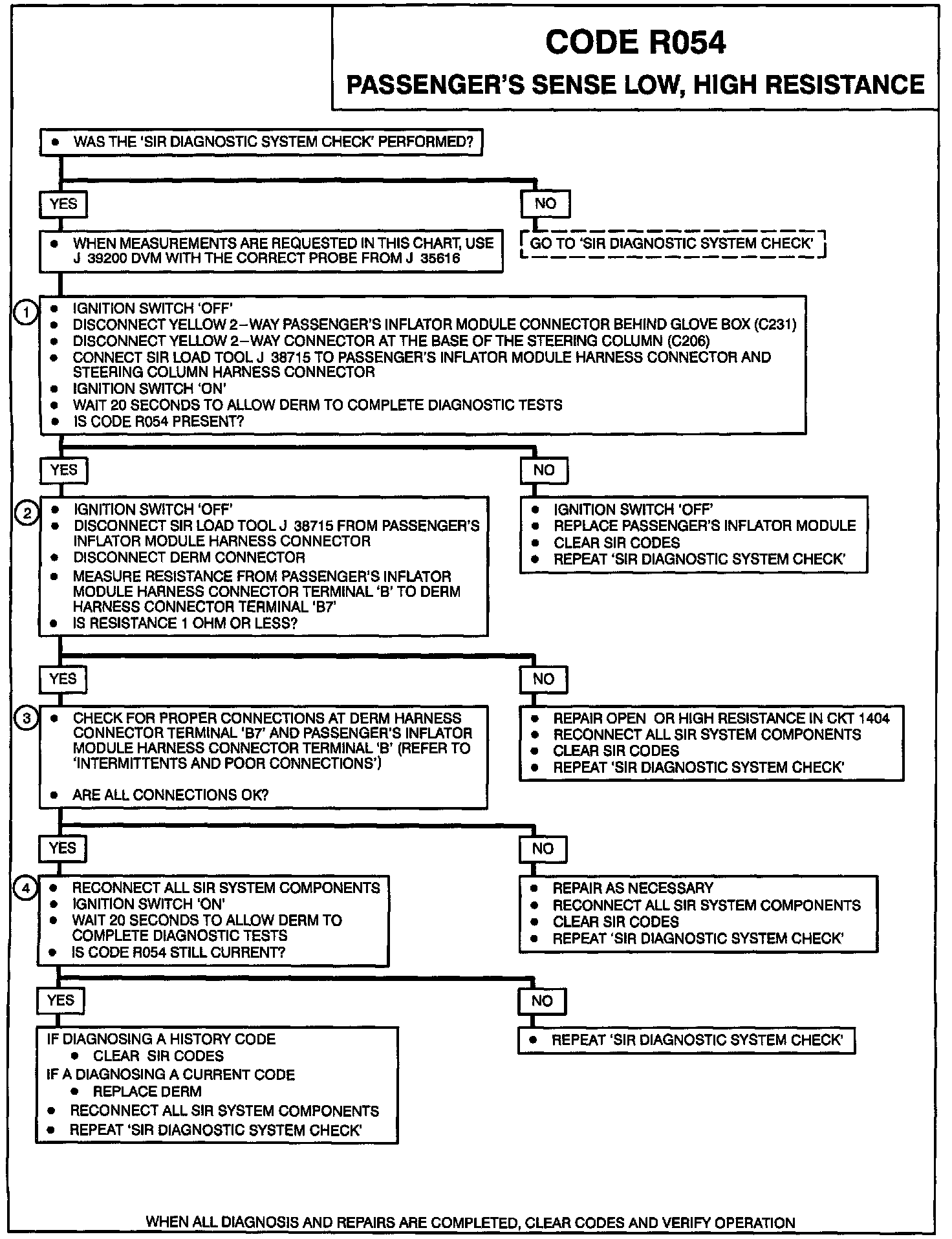 During the 'Initiator Circuit Resistance' tests, the DERM injects a 150 milliampere current from the 'DRIVER'S SENSE HIGH', terminal 'B9', to the 'PASSENGER'S SENSE LOW', terminal '137', for 50 milliseconds. The DERM then injects a 150 milliampere current from the 'PASSENGER'S SENSE terminal 'A7', to the 'DRIVER'S SENSE LOW', terminal '138', for 50 milliseconds. During these tests, the DERM calculates the voltage difference between the 'PASSENGER'S SENSE HIGH', terminal A7', and the 'PASSENGER'S SENSE LOW', '137' terminals. This voltage difference is used to determine the combined resistance of the Passenger's Inflator Module, harness wiring and connector terminal contacts. Code R054 sets for the entire ignition cycle when resistance is greater than a specified value, or an open exits in the 'PASSENGER'S SENSE LOW' circuit between the DERM and the Passenger's Inflator Module connector.