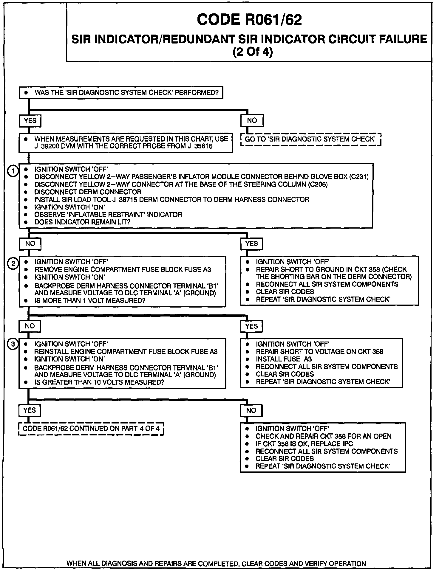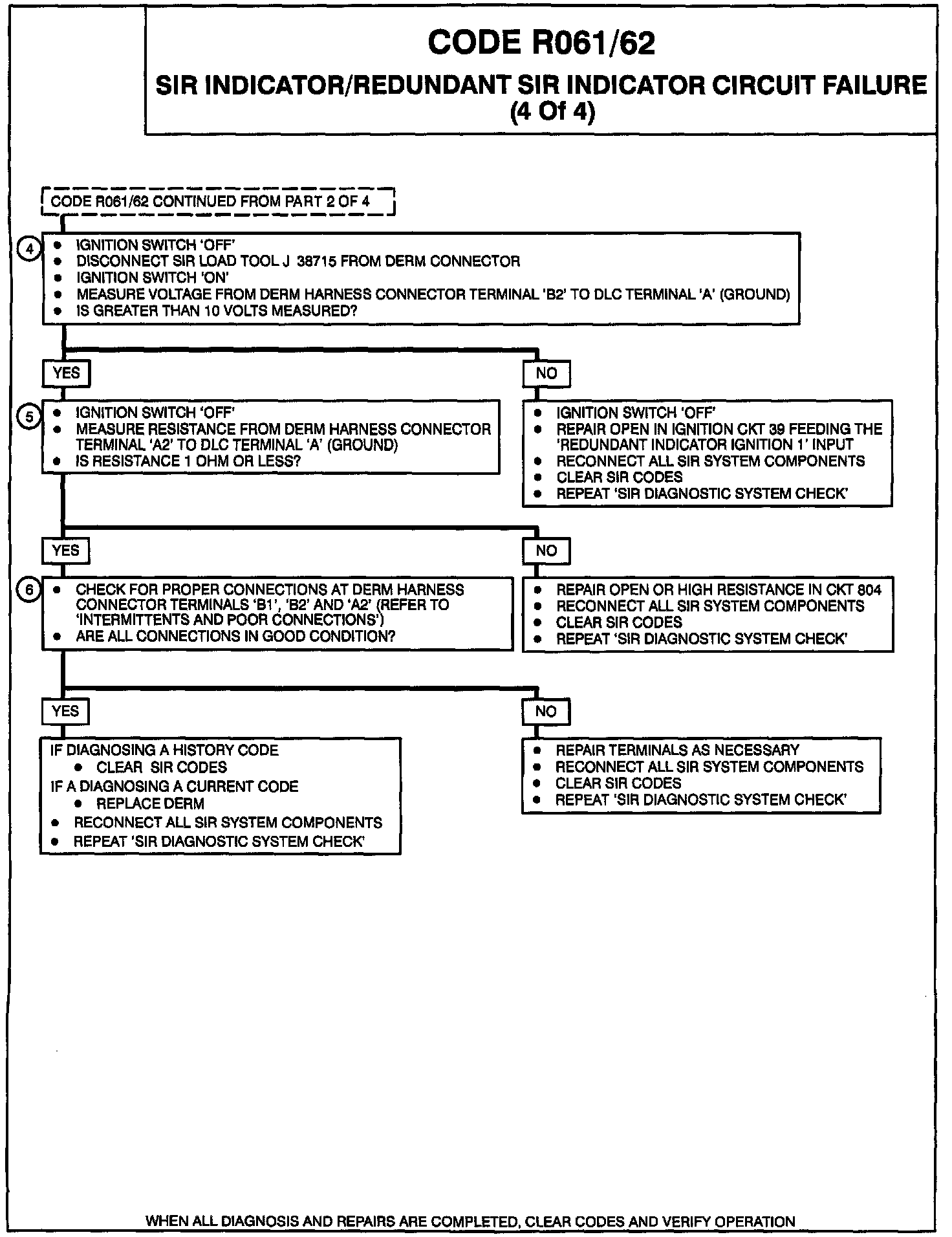 When the ignition switch is first turned 'ON', battery voltage is applied to the 'INFLATABLE RESTRAINT' indicator and to the Ignition 1 terminals 'A9' and 'A10'. The DERM responds by flashing the 'INFLATABLE RESTRAINT' indicator seven times alternating between the primary and redundant lamp drivers. Codes R061 and/or R062 set when the DERM detects a primary and/or redundant lamp driver failure during the DERM's 'Continuous Monitoring' tests. When the output state of the lamp driver does not match the commanded state, Codes R061 and/or R062 will set for the entire ignition cycle.