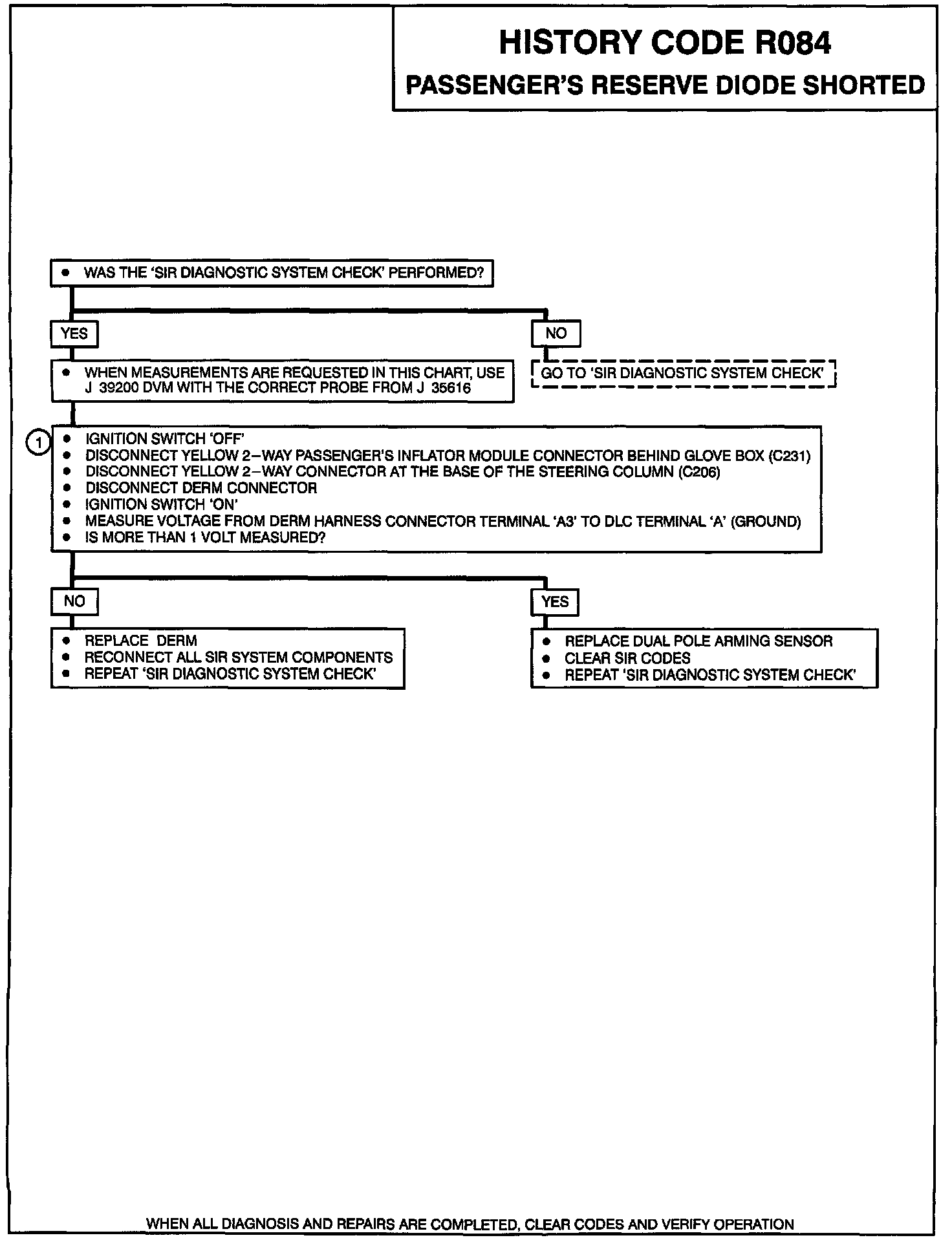 The DERM checks the Dual Pole Arming Sensor for a shorted passenger reserve diode once each ignition cycle during 'Turn-On tests. The DERM delays charging of the 'PASSENGER'S 36 VLR' power supply. While the delay is active, the DERM measures voltage at the 'PASSENGER'S 36 VLR' terminal 'A3'. When the Passenger's Diode is shorted, voltage is measured at 'PASSENGER'S 36 VLR' terminal 'A3' and the DERM increments an internal counter. If the DERM detects a shorted passenger reserve diode for eight consecutive ignition cycles, the counter stops incrementing and sets a History Code R084. The DERM resets the counter to zero when Code RO84 is cleared through On-Board diagnostics. If the failure conditions are not met, the counter remains unchanged.
