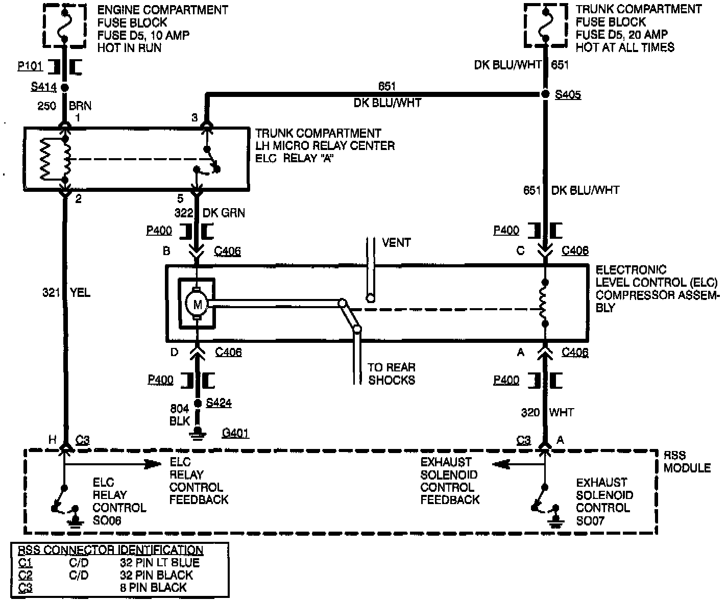 Leveling errors are detected via a single error feedback signal from a four channel integrated circuit Quad Driver Module (QDM) which drives both the compressor relay and the exhaust solenoid. The RSS module monitors this discrete feedback through all four possible leveling states (Compressor = Off Exhaust = Off, Compressor = Off Exhaust = On, Compressor = On Exhaust = Off, Compressor = On Exhaust = On) and decodes it only once all four states have been seen. All four states occur slightly after every ignition on when the leveling system goes through an Air Replenishment Cycle, as well as during normal operation. Only electrical problems with the compressor relay will be flagged. Compressor motor problems and pneumatic leakage problems will not set a code but the RSS module will shut the compress function off if no progress is made or if excessive run time occurs.