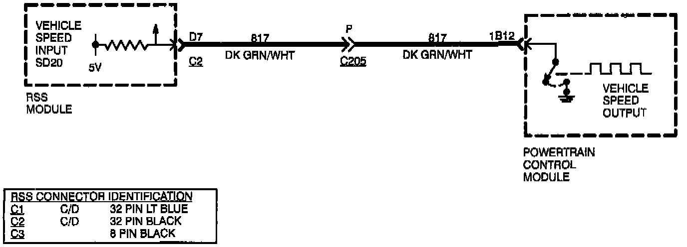 With every regularly scheduled diagnostic communication, the IPC passes its calculated road speed to the RSS module. The module compares this road speed to the RSS calculated road speed. If the IPC road speed is greater than 20 MPH while the RSS road speed is less than 3 MPH for 10 seconds, this error is activated.