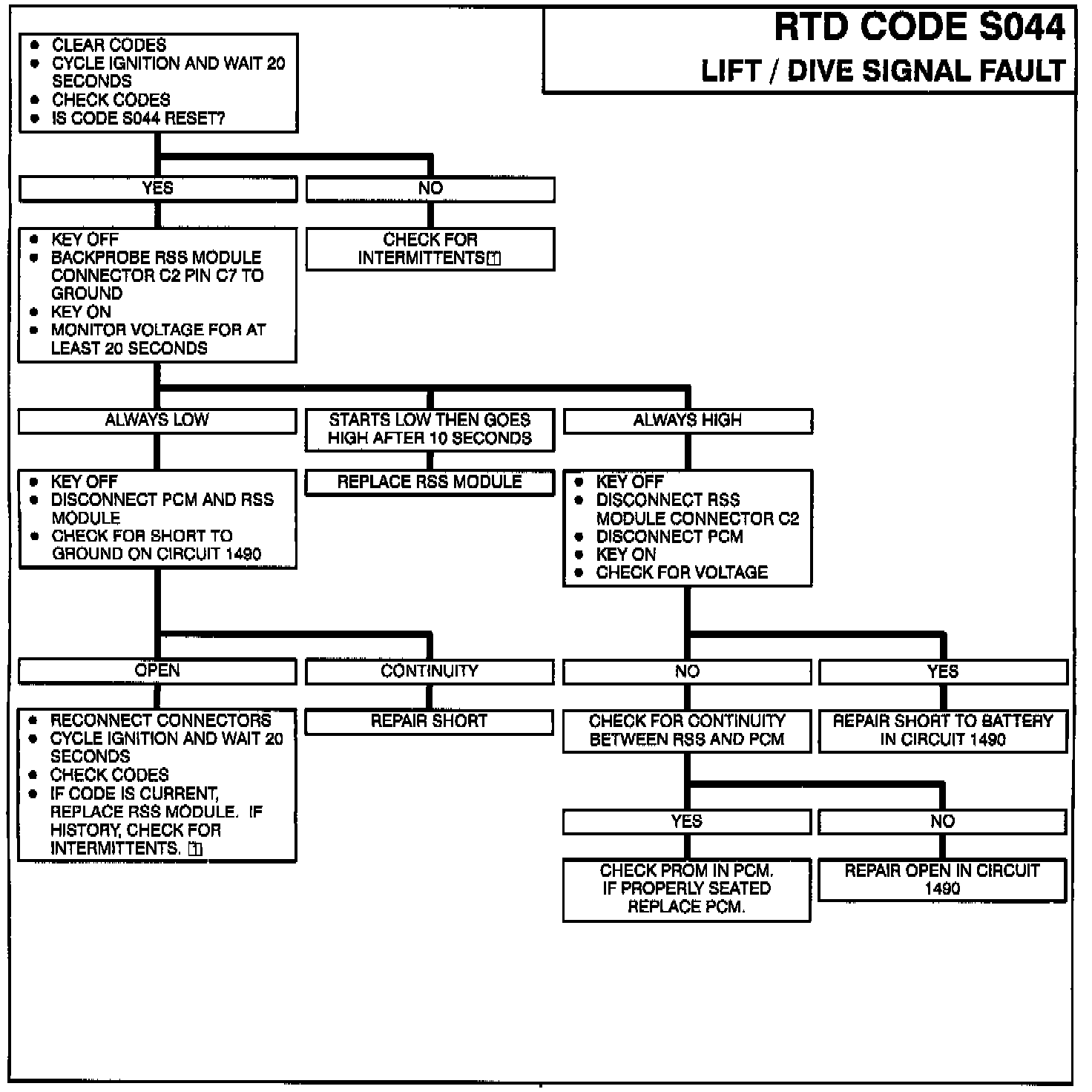 For 1 to 20 seconds after vehicle crank, the RSS module monitors the lift/dive signal. If no signal is detected, this error is activated. A new ignition cycle is required to clear this error.