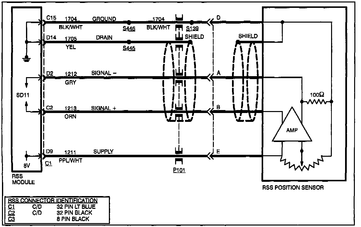 The RSS module monitors the position sensor data for a sensor out of range condition. The signal is out of range if it is under voltage (0.25 V) or over voltage (4.75 V) or if an invalid data condition is signaled. If the signal is out of range for more than 1/2 second at a vehicle speed greater than 5 MPH, the error is set.