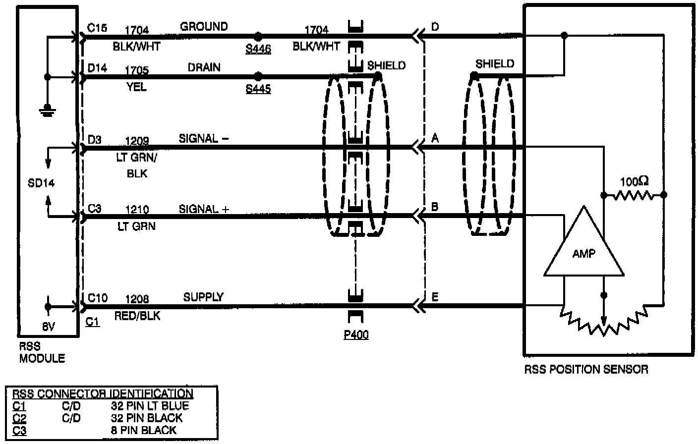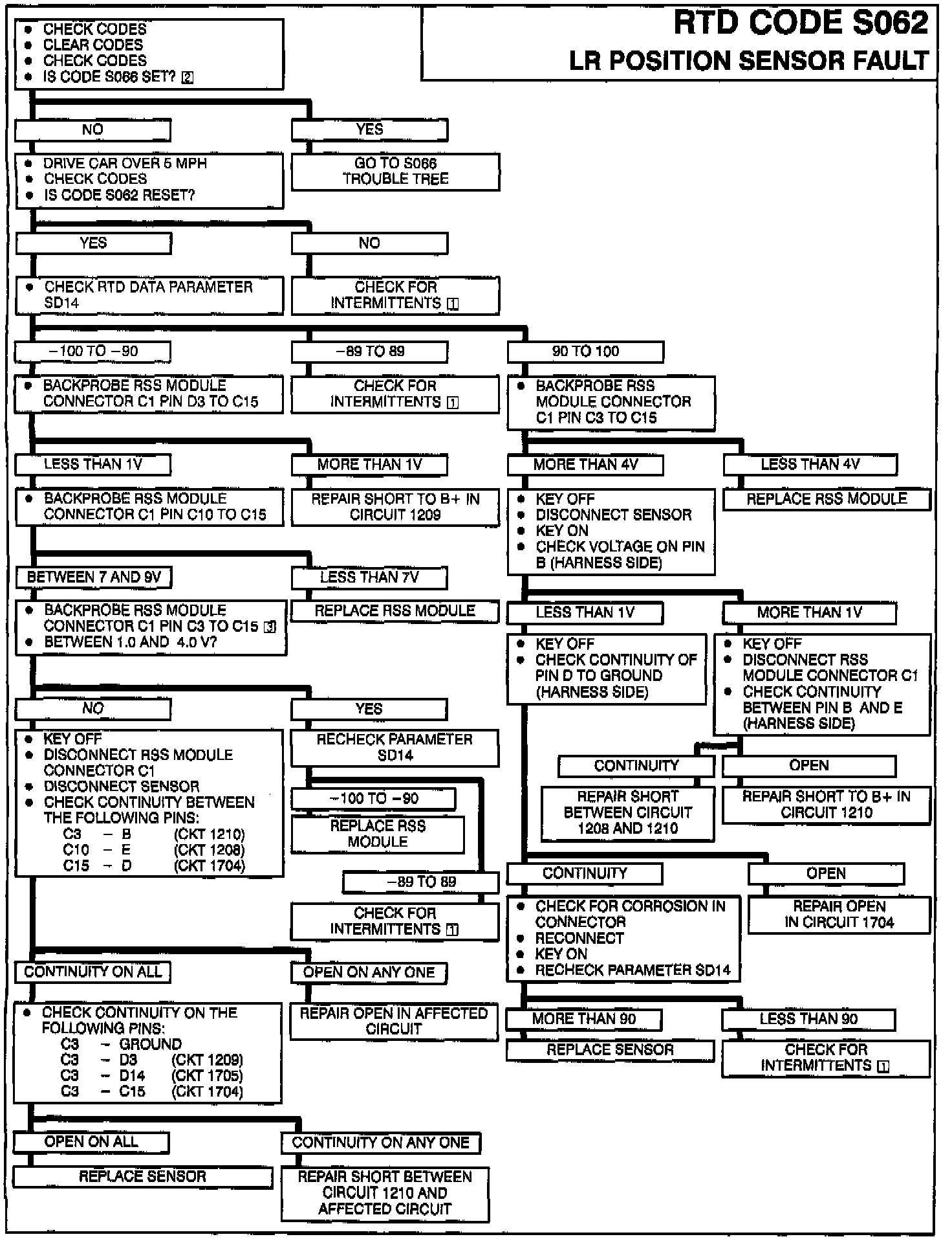 The RSS module monitors the position sensor data for a sensor out of range condition. The signal is out of range if it is under voltage (0.25 V) or over voltage (4.75 V) or if an invalid data condition is signaled. If the signal is out of range for more than 1/2 second at a vehicle speed greater than 5 MPH, the error is set.