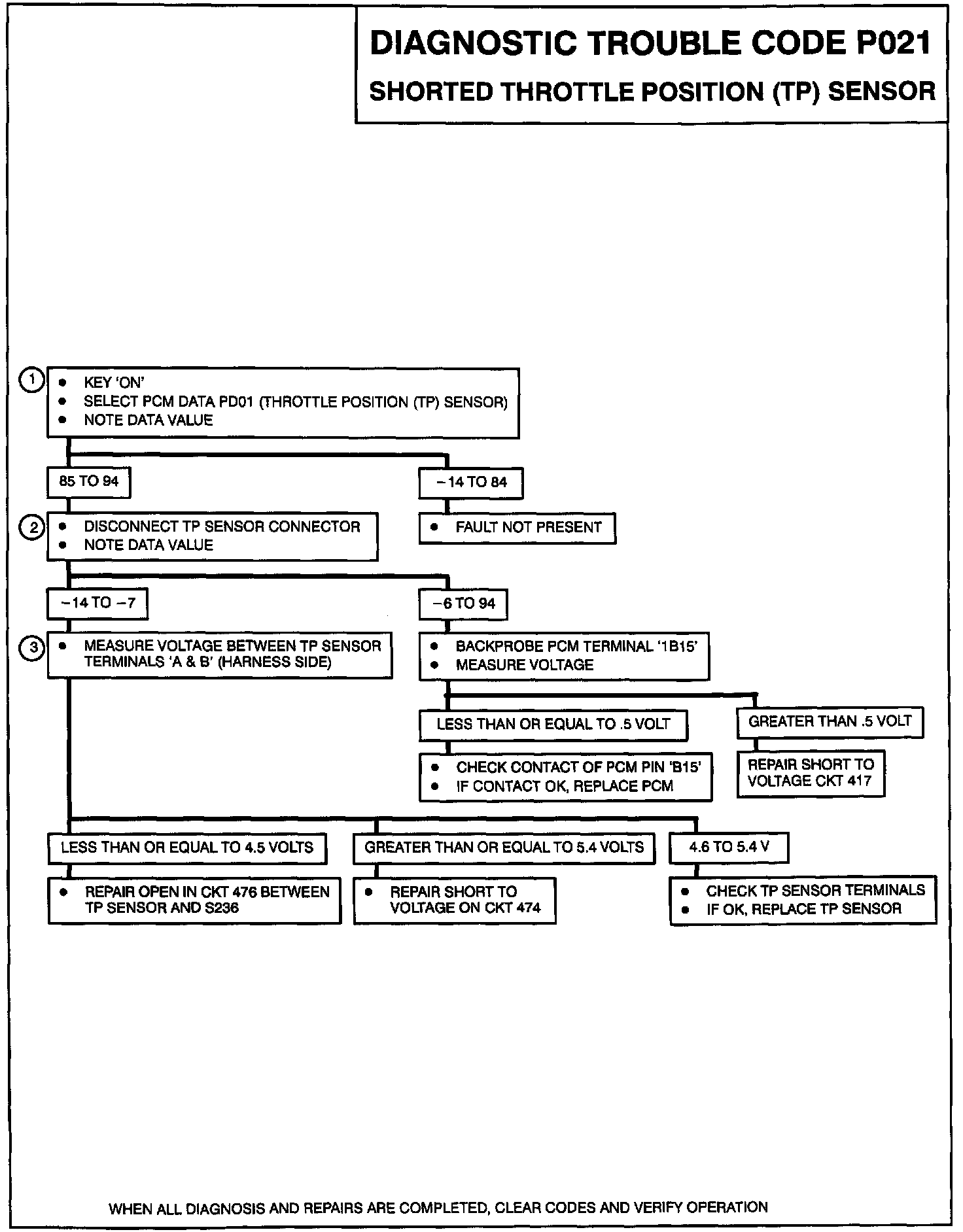 The Throttle Position (TP) sensor is a potentiometer. A 5 volt reference is provided on CKT 474 and ground is provided on CKT 476. The TP sensor signal CKT 417 varies between ground and 5 volts based on the position of the throttle plates. At low throttle angle, the TP sensor signal voltage is low. The PCM uses TP sensor information to determine idle, Wide Open Throttle (WOT), deceleration enleanment and acceleration enrichment. Code P021 sets when the PCM detects a TP sensor signal that is too high.