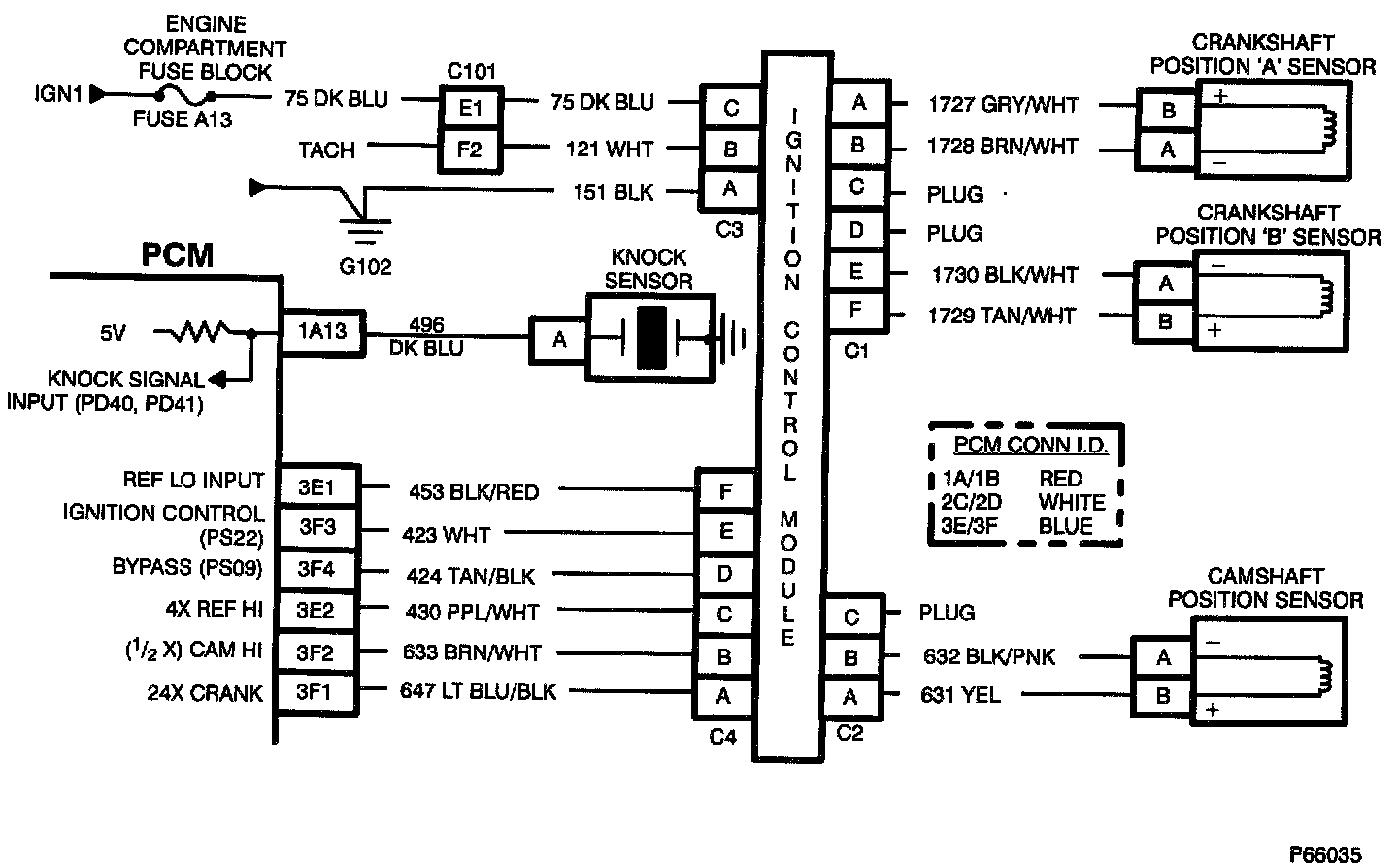 2. 4X reference pulses are being received by the PCM and the bypass line is high, and the PCM does NOT detect a signal on the ignition control line. This could be caused by an open or a shorted to ground ignition control line or bypass line open or shorted to ground.