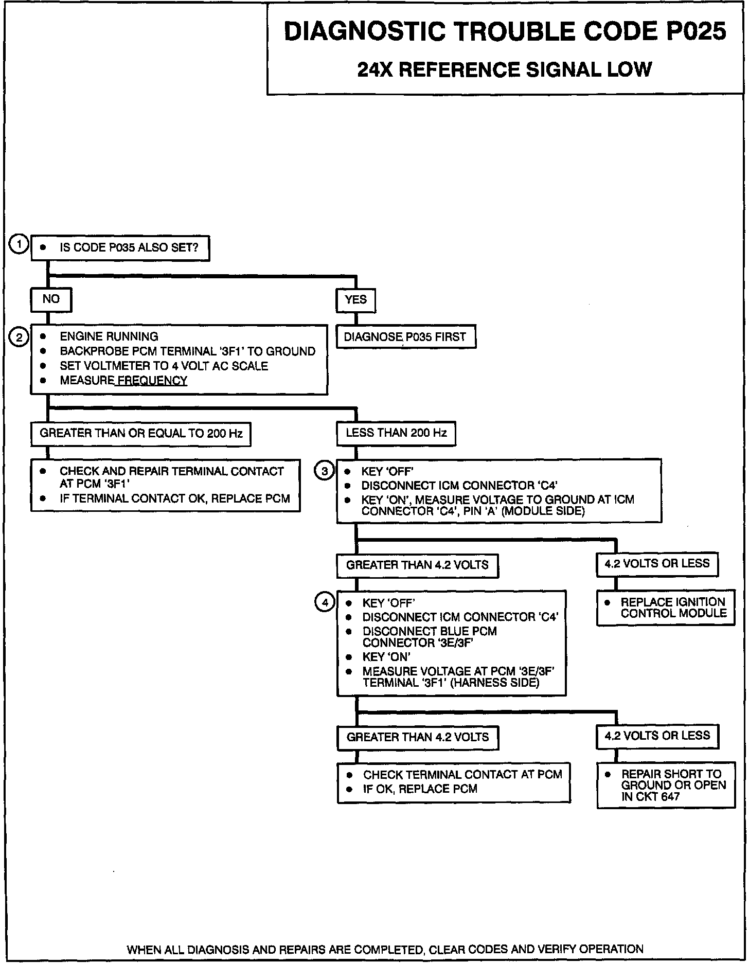 This diagnostic test, the PCM checks for 4X reference pulses being received without 24X reference pulses. When the engine is running and the PCM is receiving 4X reference pulses without 24X reference pulses and the 24X reference signal line is low for 4 seconds, Code P025 is set.