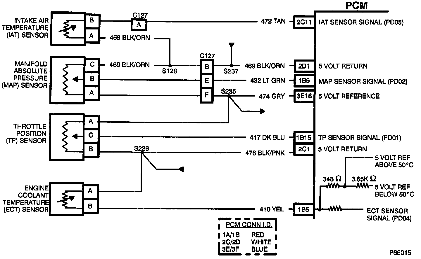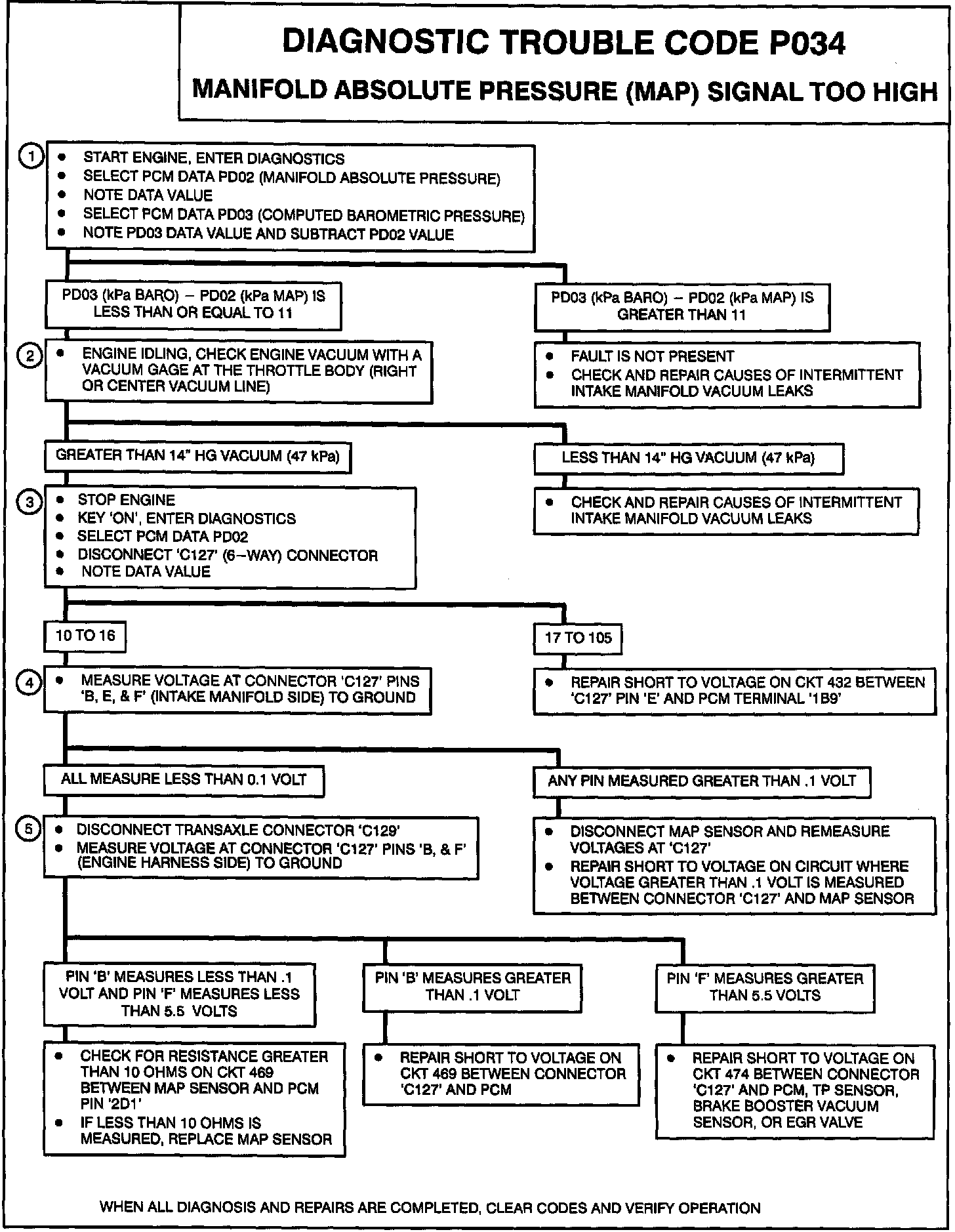 3. PCM data PD02 should read 10-16 kPa with C127 disconnected. If PD02 reads greater than 16 kPa, check CKT 432 for a short to voltage.