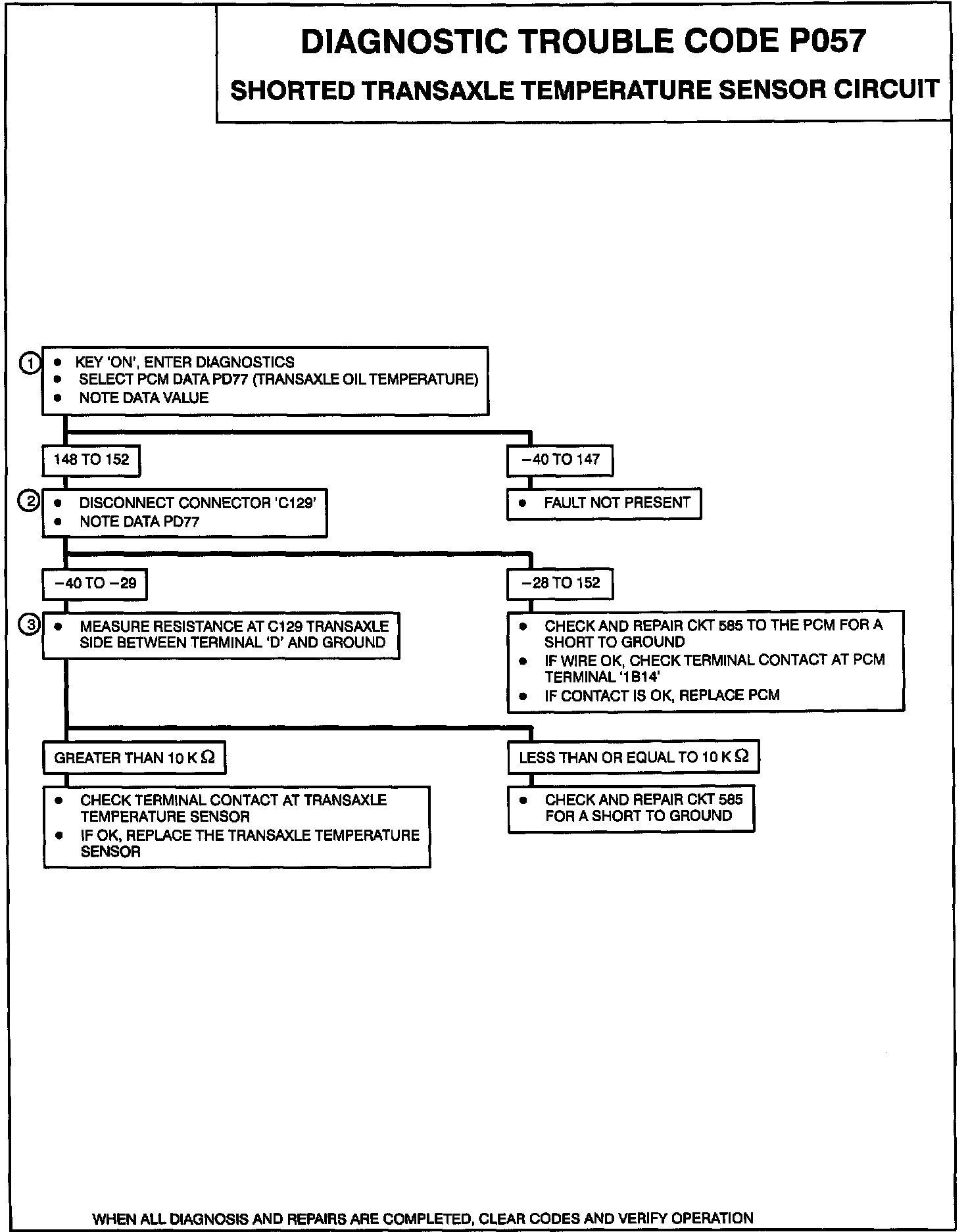 3. Checking for a short to ground on CKT 585 inside the transaxle. If wire OK, replace the shorted transaxle temperature sensor.