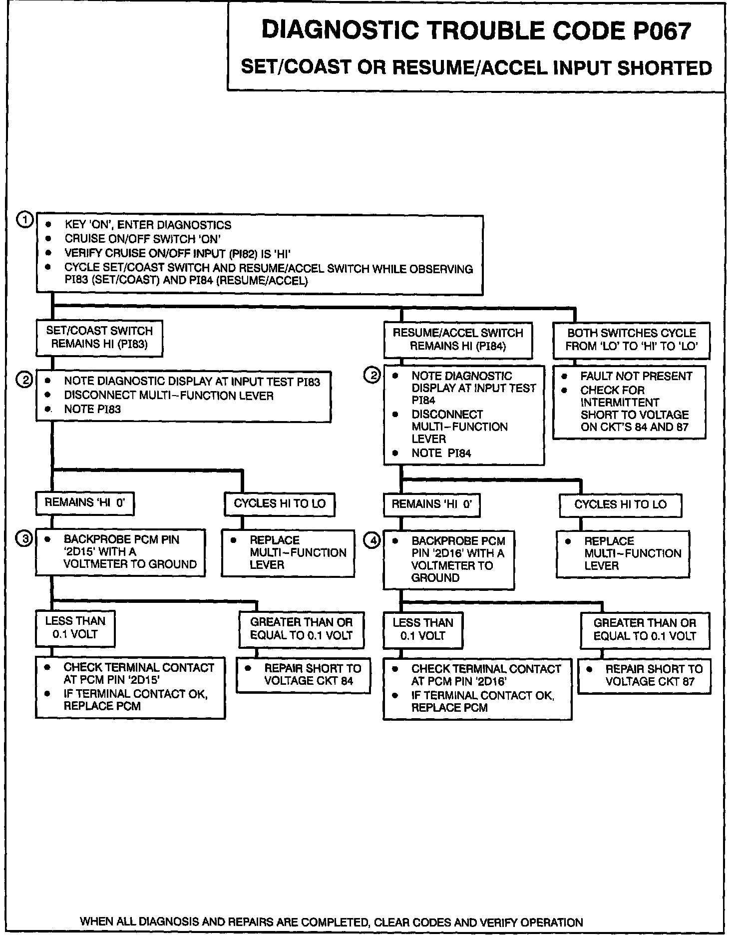 1. Checking if PI83 (SET/COAST) and PI84 (RESUME/ACCEL) will cycle from 'LO' to 'HI' to 'LO'. If the inputs remain 'HI', there is a short to voltage in the system.