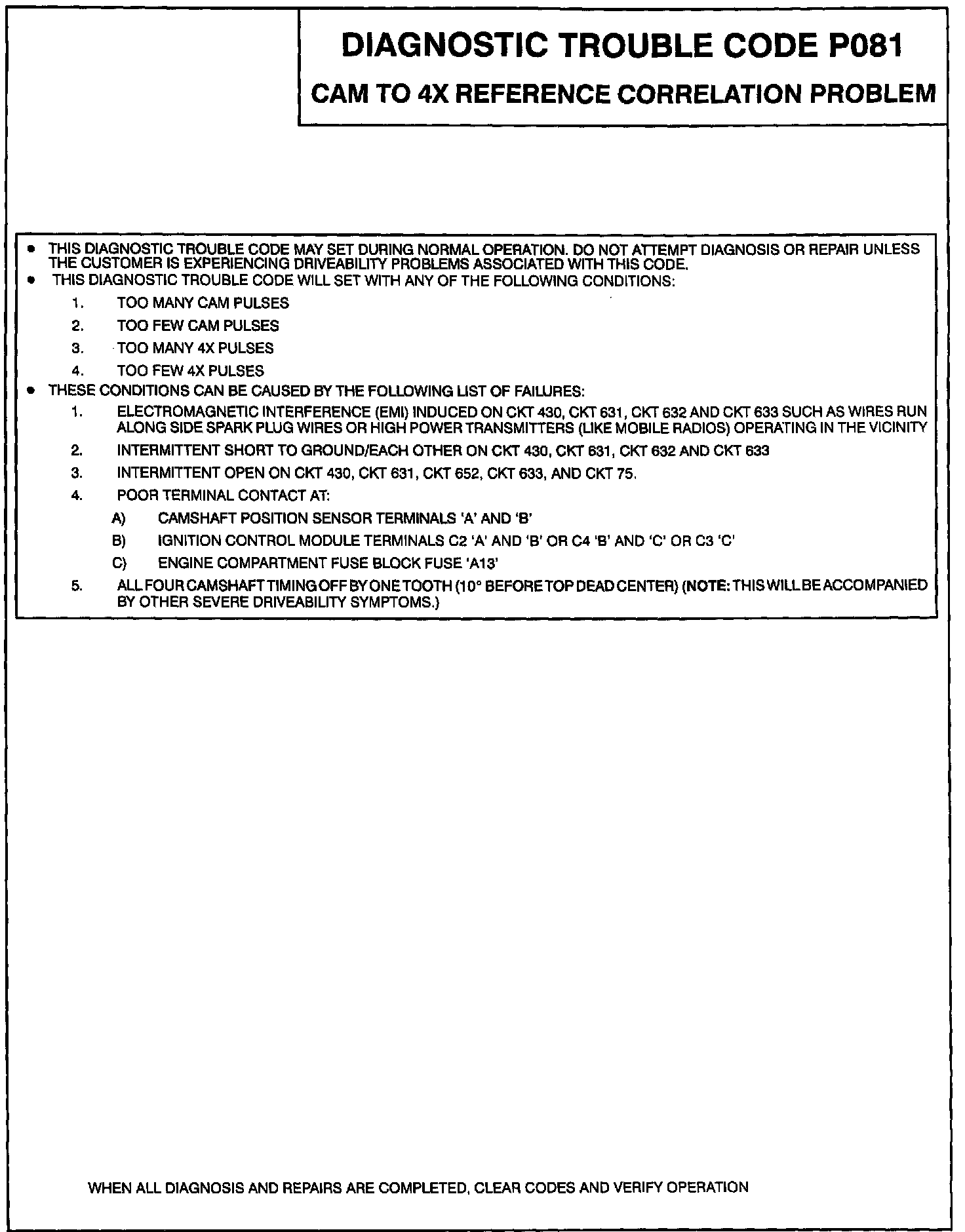 This diagnostic test checks to see if there are eight 4X reference pulses between CAM signals. When this is not true Code P081 is set. Do not attempt diagnosis or repair unless the customer is experiencing driveability problems associated with this code.