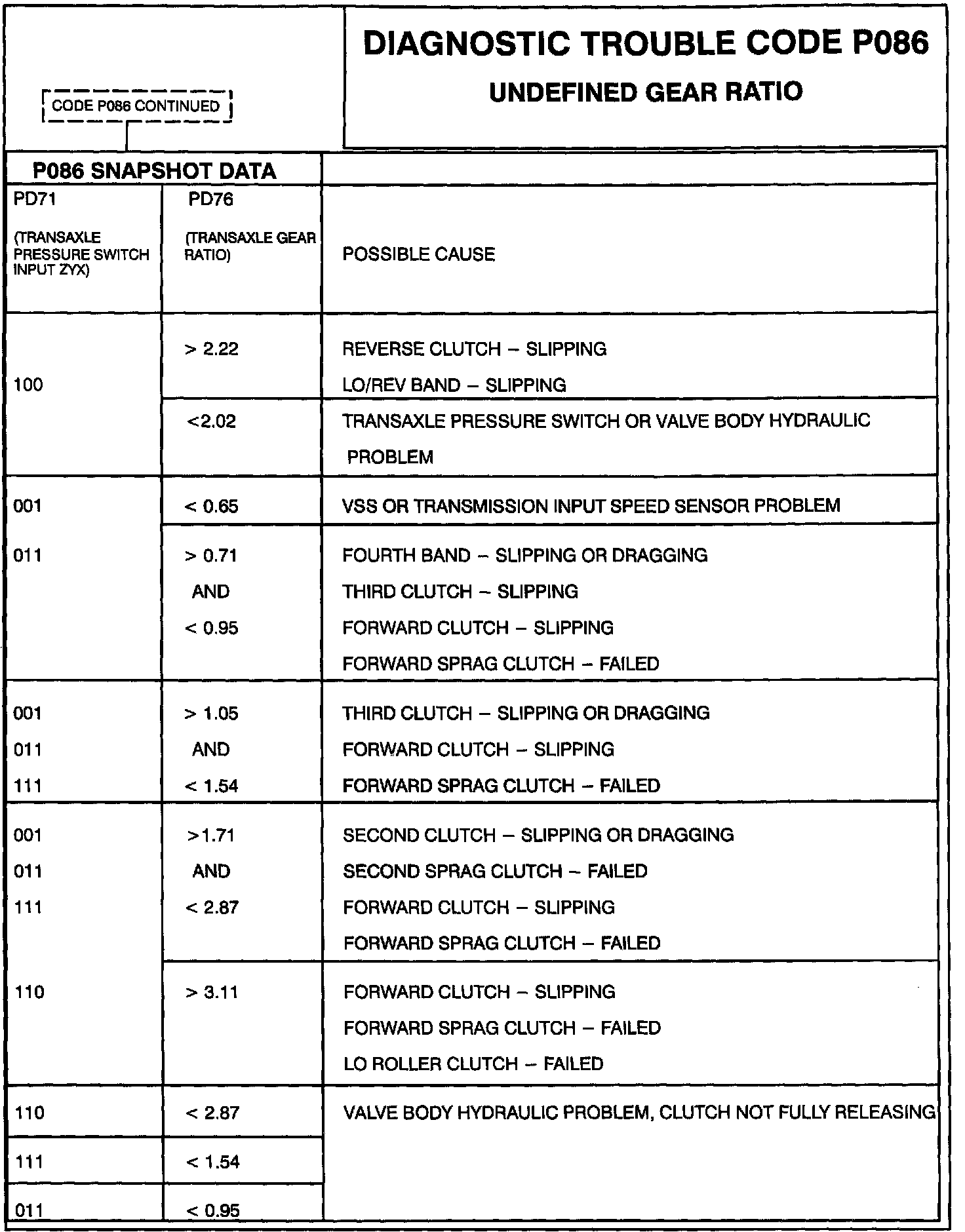 The gear ratio of the transaxle is calculated from the ratio of the turbine speed over the output speed. This diagnostic test checks for gear ratio which is not possible to obtain under normal operating condition of the transaxle, if such a gear ratio is observed, Code P086 is set.