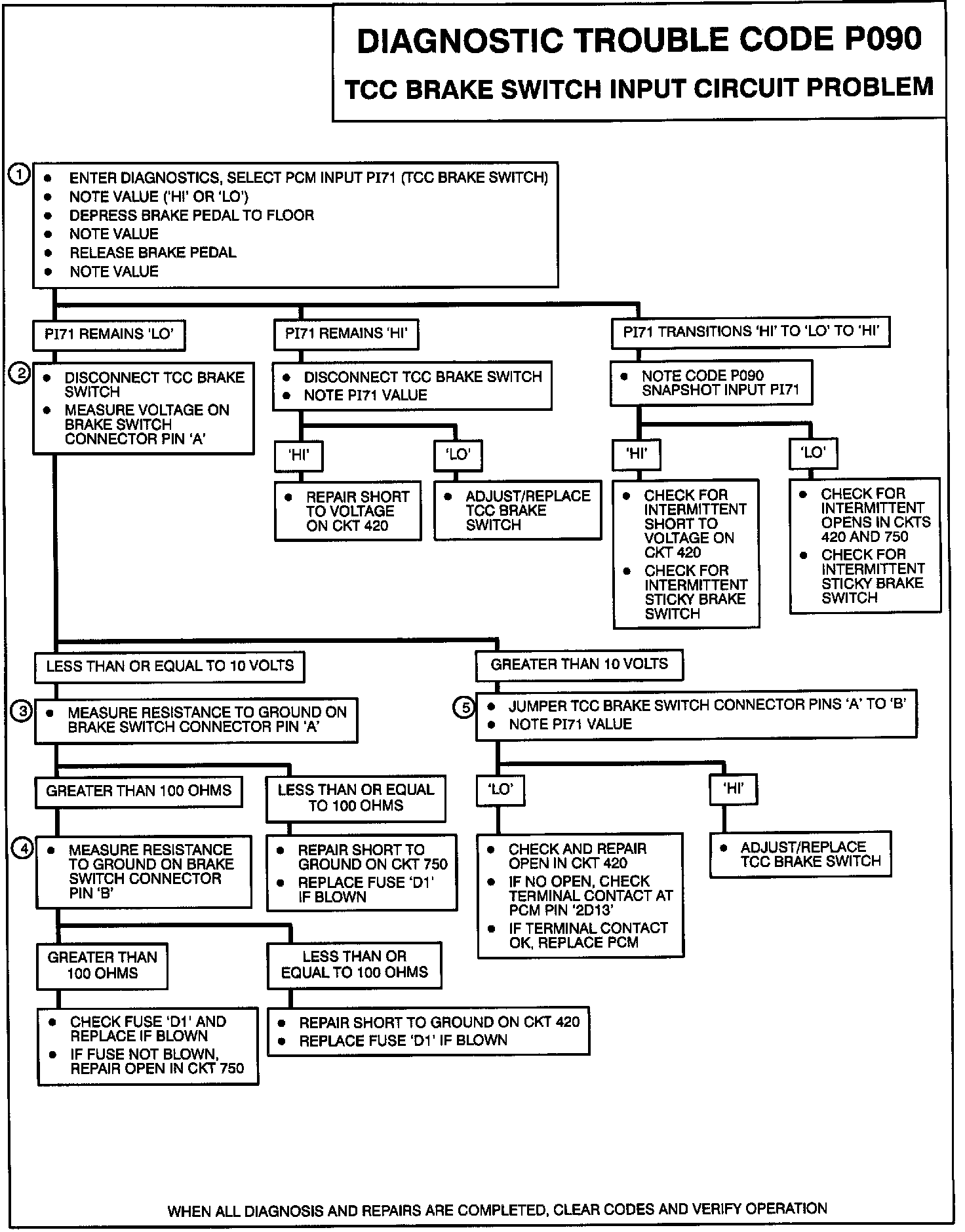 This diagnostic test functions on the assumption that a sudden decrease in non-drive (rear) wheel speed must be caused by a brake application. Non-drive wheel speed and stop lamp switch status are supplied to the PCM through serial data from the Electronic Brake and Traction Control Module (EBTCM). If there is a 2.5 mph or greater decrease of non-drive wheel speed in 0.2 second and a transition of the extended travel brake contacts of the TCC brake switch or stop lamp brake switch without a transition of the TCC switch contacts of the TCC brake switch the counter is incremented. When the counter reaches 5, Code P090 is set. The counter will be reset to zero if a transition of the TCC contacts of the TCC brake switch is noticed before the counter reaches 5.