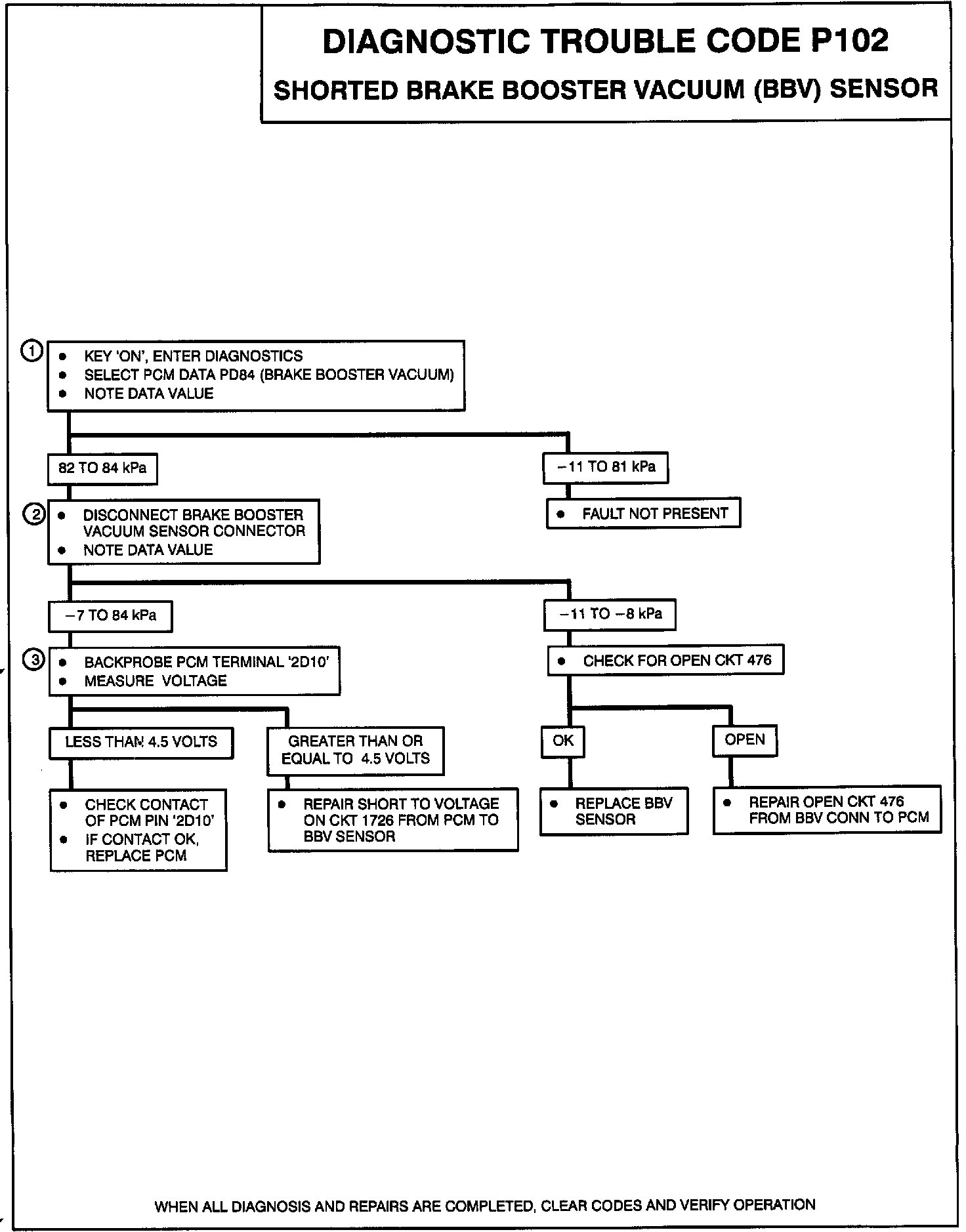 The brake booster vacuum sensor changes resistance based on the vacuum inside the brake booster. This diagnostic test checks for a vacuum sensor reading which would be caused by a shorted sensor or a short on CKT 1726 or an open on CKT 476 (i.e. sensor voltage 5 volts (82 kPa VAC) or greater). Every time the TCC brake switch cycles from closed to open with the engine not at idle, this test checks for a shorted vacuum signal. If a shorted vacuum signal is detected for five consecutive cycles of the TCC brake switch, Code P102 will set. Any cycle of the TCC brake switch where a shorted vacuum signal is not detected will reset the counter to zero.