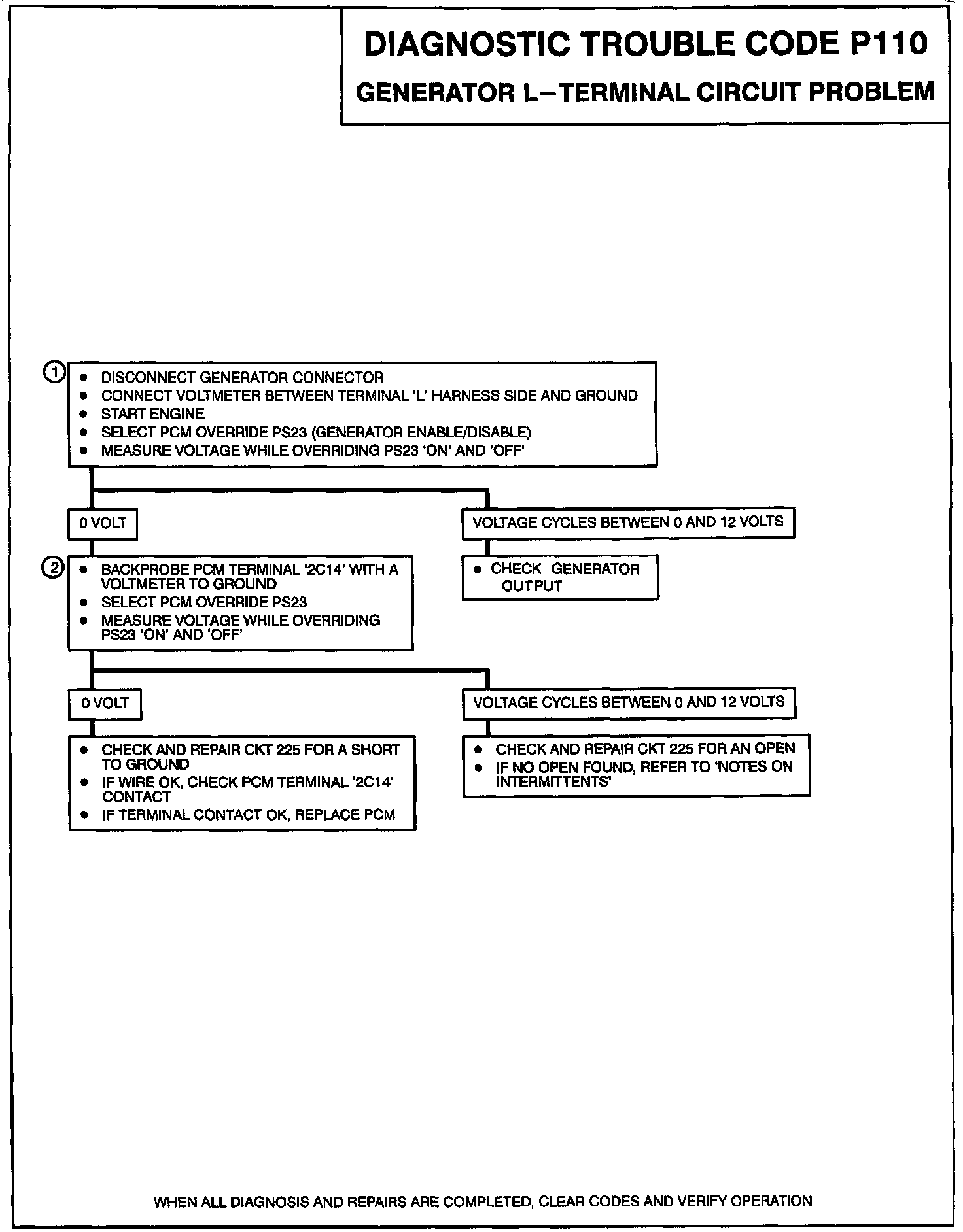 The generator can detect internal faults. If this occurs for 15 seconds, the PCM will set Code P110. The generator can self- diagnose a shorted output diode, malfunctioning regulator, open or shorted rotor, over-or-under voltage condition, shaft not rotating, or open sense lead.