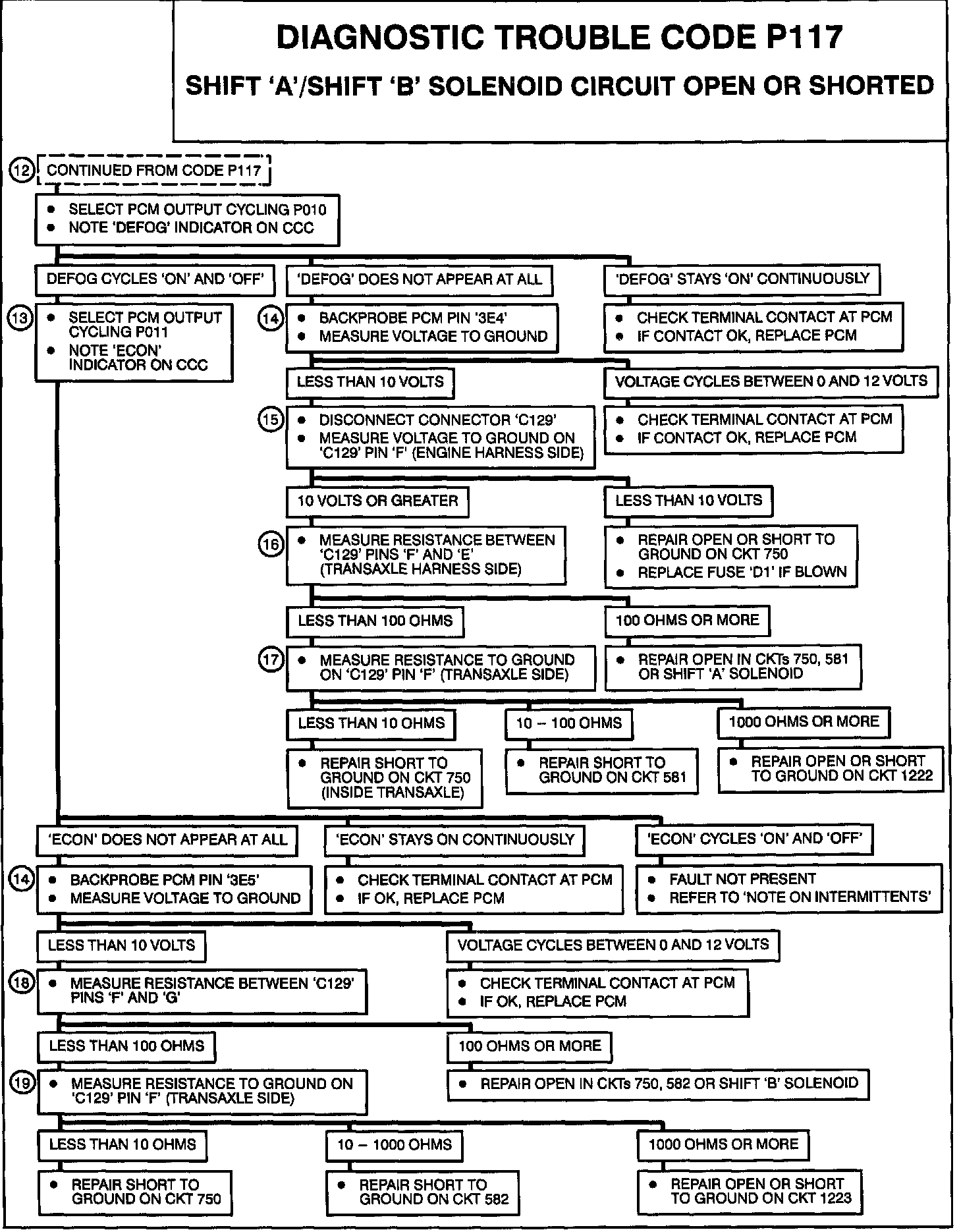 19. Checking for a short to ground. If resistance is 1000 ohms or less, the short is inside the transaxle. If resistance is greater than 1000 ohms, the short is between 'C129' and PCM.