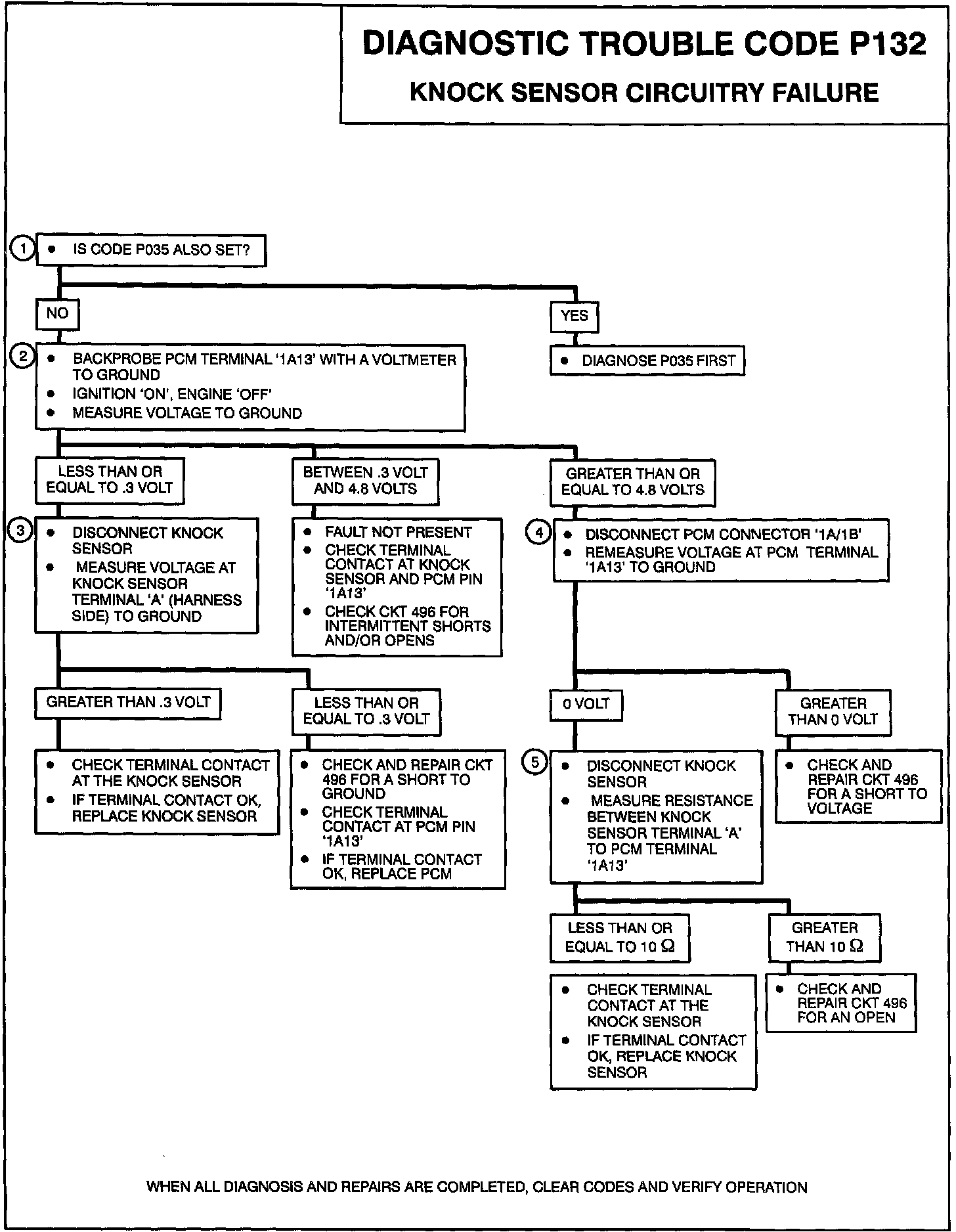 If CKT 496 becomes open or shorted, the voltage will either go above 4.8 volts or below 0.3 volt. If either of these conditions are met for 0.4 second, Code P132 is set.
