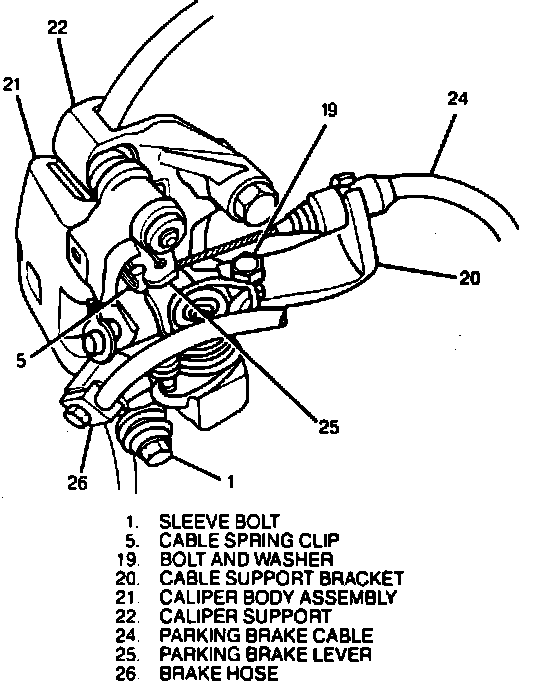 5. Remove bolt and washer attaching cable support bracket to caliper body assembly.