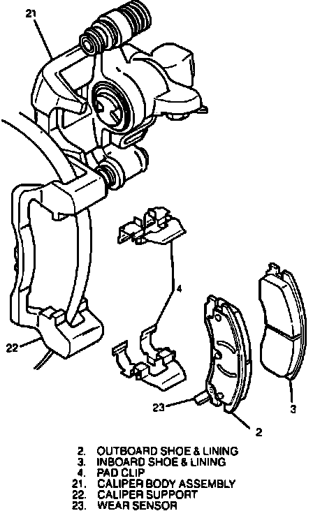 10. Install pad clips and outboard and inboard shoe and linings in caliper support. Ensure wear sensor is on outboard shoe positioned downward at leading edge of rotor during forward wheel rotation.