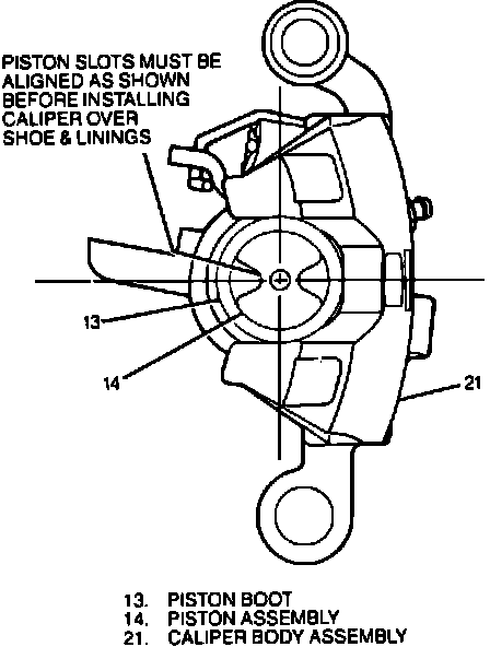 11. Pivot caliper body assembly down over shoe and lining assemblies being careful not to damage piston boot on inboard shoe.