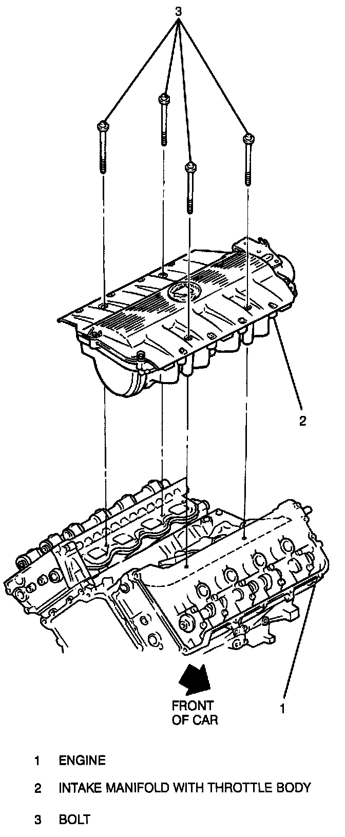 11. Four intake manifold bolts and lift intake manifold with throttle body out of engine compartment.