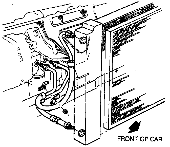 6. Connect oil cooler lines to oil filter adapter. Shorter of the lines connects the lower cooler connection (at radiator) to the forward most oil filter adapter fitting.