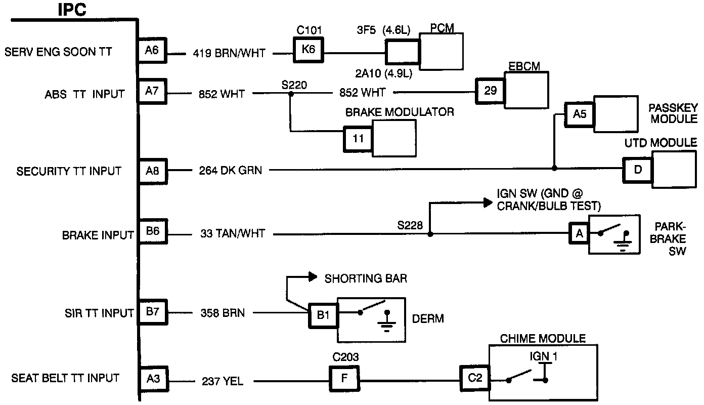 The BRAKE telltale is directly controlled by switches in the vehicle. Power for the telltale is pulled from the IPC Ignition 1 input (pin 'C13' CKT 39). Refer to DIAGRAMS for diagnosis.