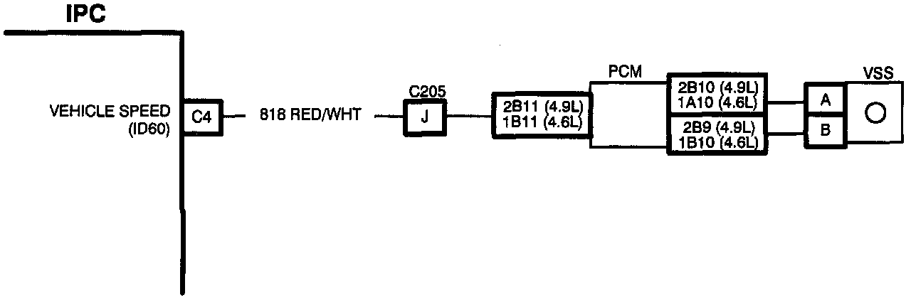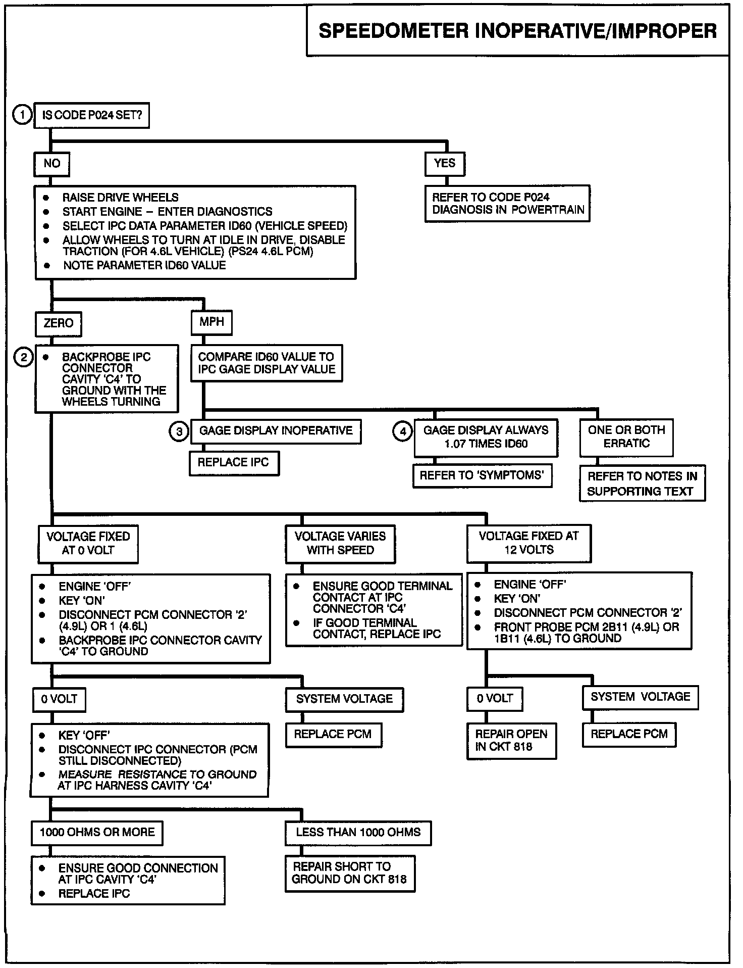 2. If ID60 (vehicle speed to IPC) reads zero, and code P024 is not set, the problem is between the IPC and the PCM. Checking voltage at 'C4' will determine if CKT 818 is being pulsed.