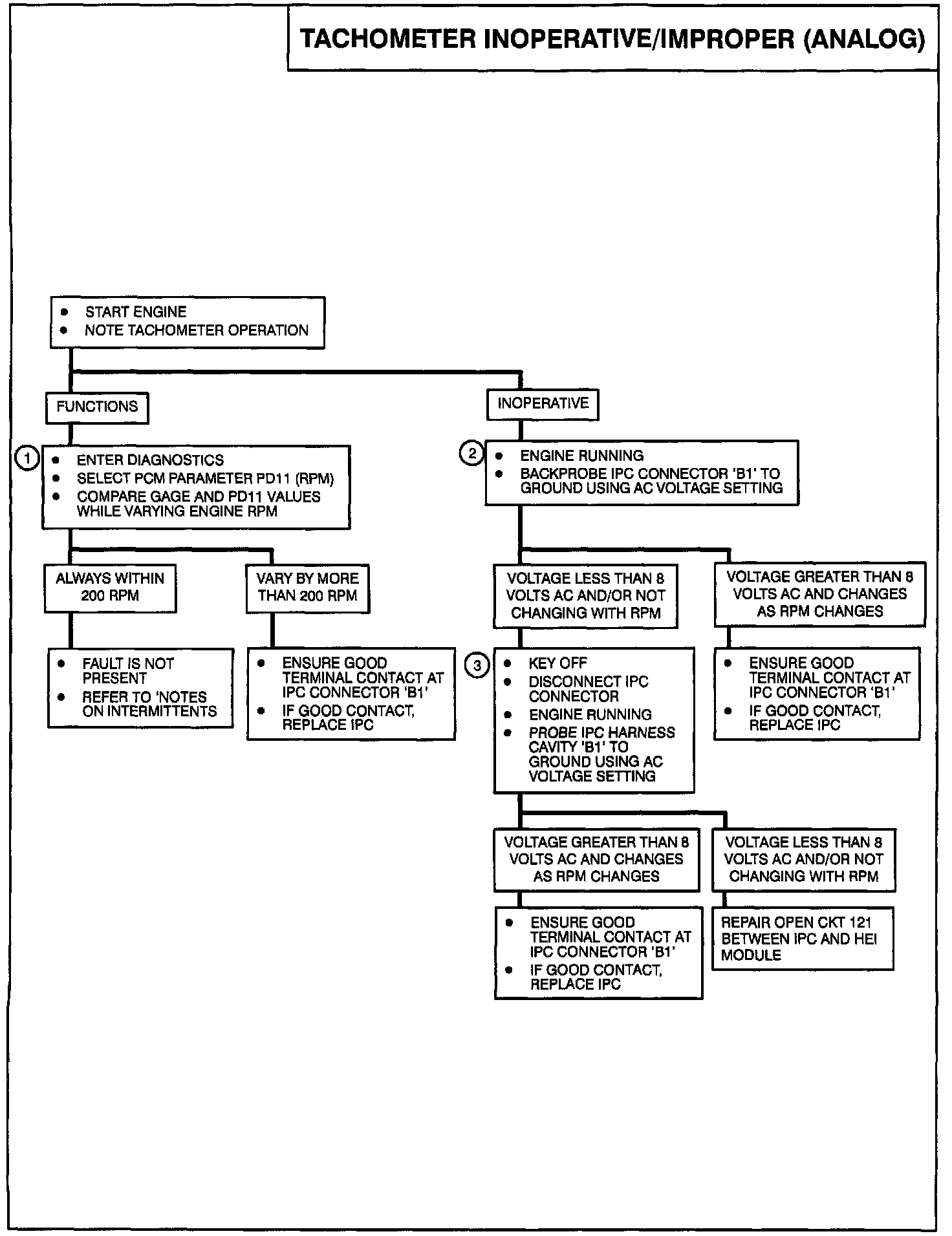 2. Normal voltage readings at the IPC Tachometer input (Cavity 'B1') are above 8 volts AC and will vary with changes in RPM.