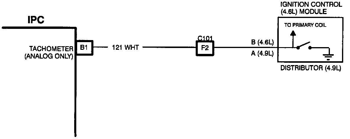 The tachometer gage in the IPC is driven directly from an output in the Ignition Control (4.6L) or Distributor (4.9L) module.