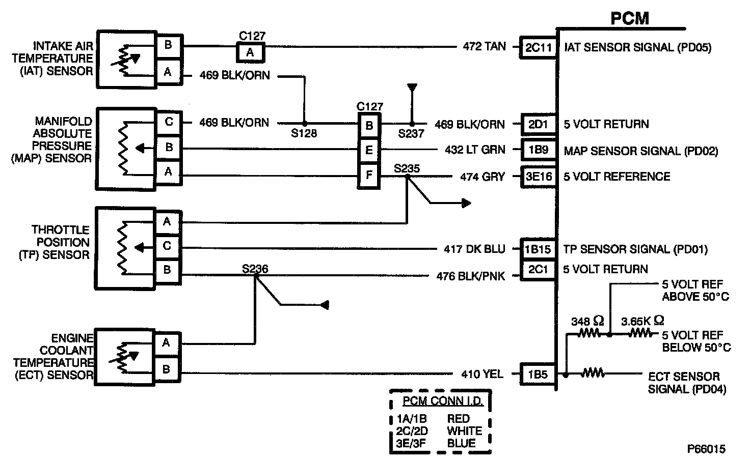 The PCM provides and internally monitors voltage to the Engine Coolant Temperature (ECT) sensor circuit through pin '1B5'. As the coolant temperature changes from cold to hot, the sensor's resistance changes from high to low and therefore the sensor voltage that the PCM monitors will change from high to low. When the calculated engine coolant temperature is greater than 131°C (low voltage), the PCM tells the IPC to turn 'ON' the 'STOP ENGINE - ENGINE OVERHEATED' message on the DIC.