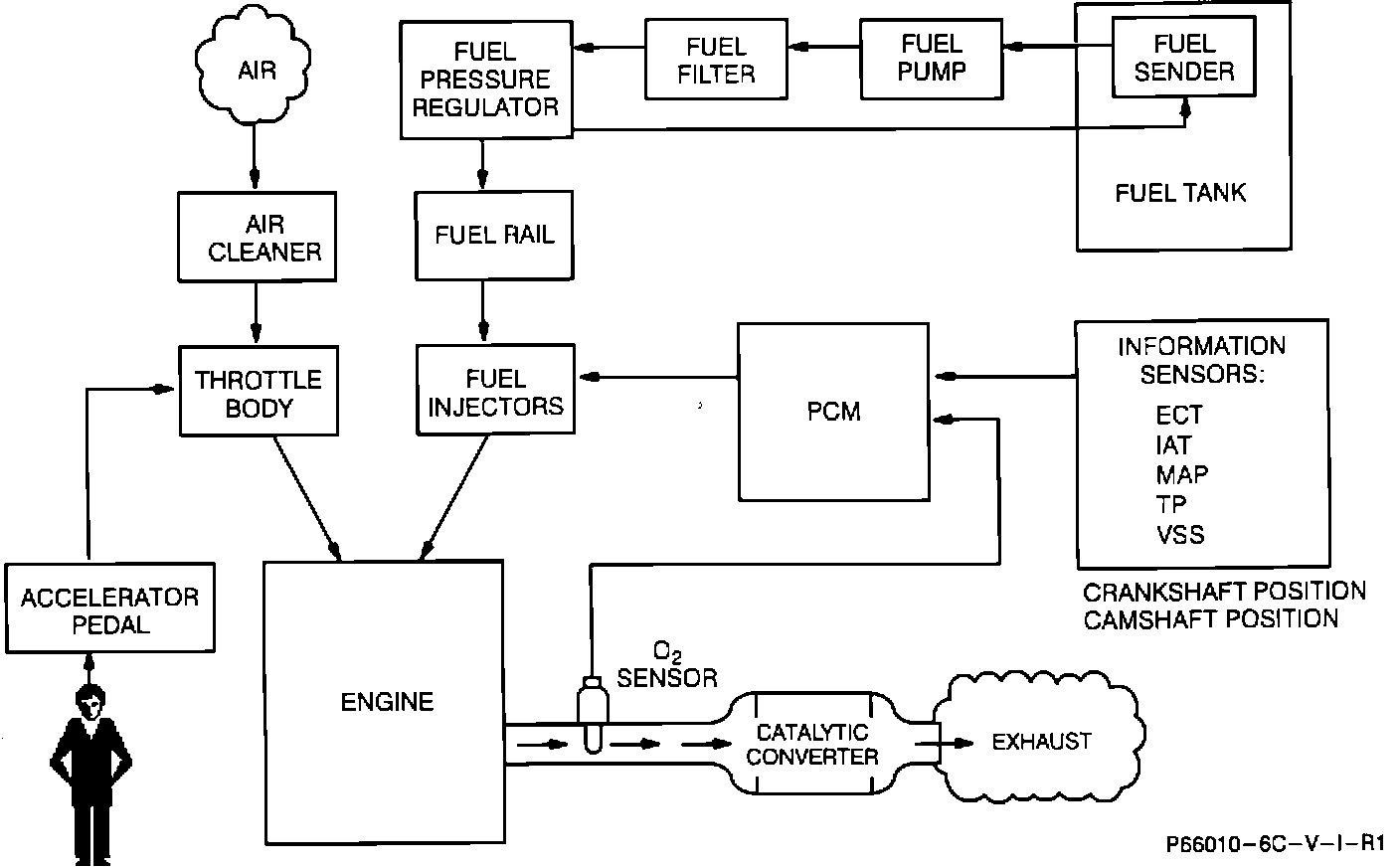 The PCM uses a Speed/Density model to calculate the fuel required to maintain an Air/Fuel ratio of 14.7 to 1. This ratio is the optimum ratio of air to fuel required for lowest exhaust emissions (called the stoichiometric ratio). The Speed/Density model looks at engine speed and air density (calculated from MAP, IAT and ECT sensor information) to determine how much air is nowing into each cylinder. The PCM then calculates the length of time each injector must be turned on to provide the correct amount of fuel. This is called injector pulse width. The PCM looks at information from the 02 sensors to see if its injector pulse width is correct and makes adjustments as necessary.