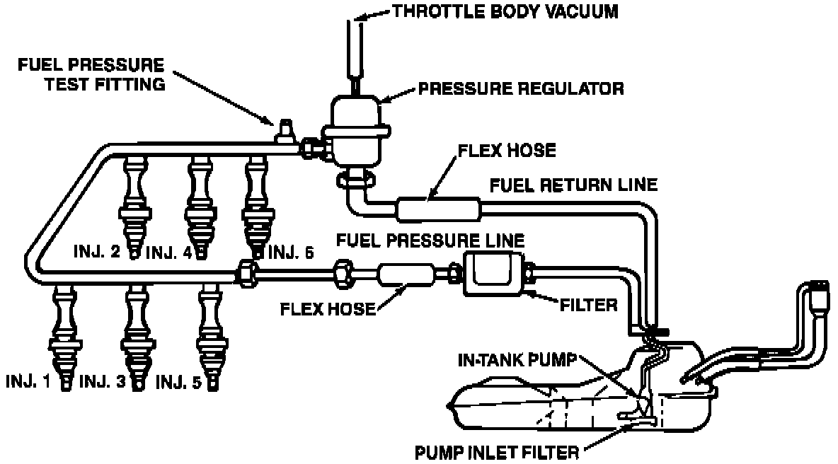 Pressure Regulator - Fuel pressure is controlled by a pressure regulator mounted on the fuel rail. The fuel system in this vehicle is recirculating; this means that excess fuel that is not injected into the cylinders is sent back to the fuel tank by a separate nylon pipe, This removes air and vapors from the fuel as well as keeping the fuel cool during hot weather operation.