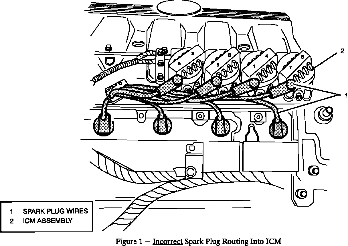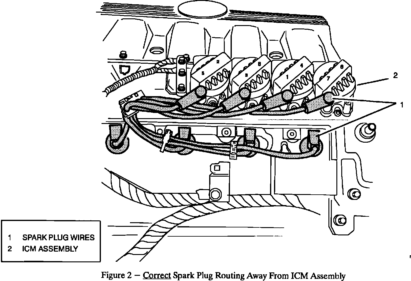 4. Remove and reinstall the rear (RH) bank spark plug wire boots so that the wires exit the boot away from the ICM Assembly. This will prevent the wires from contacting the ICM Assembly (particularly the number 1 wire). Figure 1 illustrates the incorrect way for spark plug wire routing. Figure 2 illustrates the correct way for spark plug wire routing.
