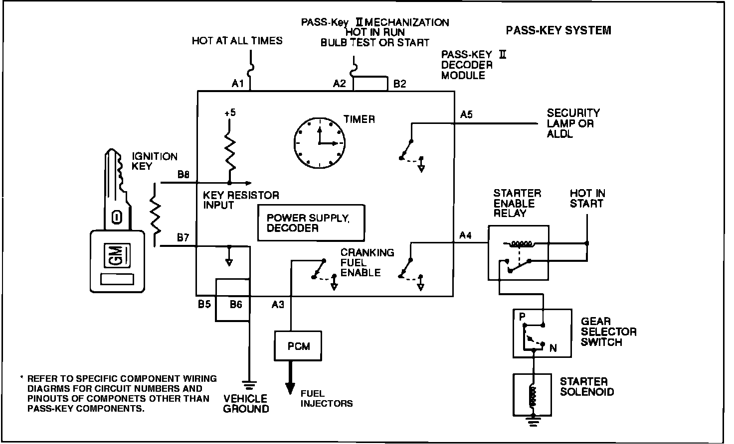 The PASS-KEY II decoder module sends a signal to the PCM, on circuit 229, if the correct key is being used. If the proper signal does not reach the PCM, it will not pulse the fuel injectors "ON" and thus not allow the vehicle to start.
