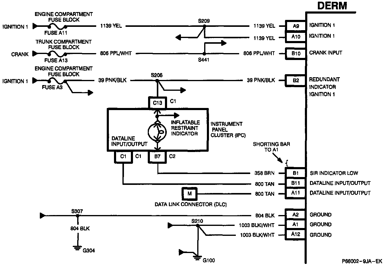 When the engine is being cranked, system voltage is applied to the DERM at the 'CRANK' terminal 'B10'. The DERM grounds the lamp circuit until system voltage is removed from the 'CRANK' terminal 'B10'. This results in a steady 'INFLATABLE RESTRAINT' indicator during cranking.