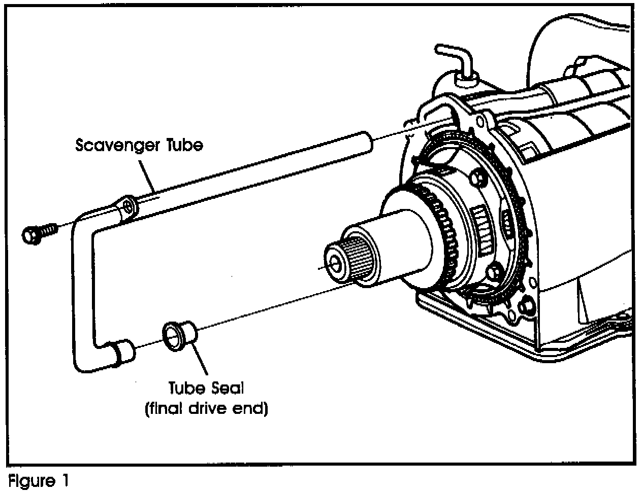 The 4T80-E uses a scavenger tube, which goes from the final drive area of the case to the driven sprocket support at the other end of the unit (figure 1). This tube uses formed rubber seals at both ends to prevent air from being sucked into the tube. These seals are critical to the operation of the triple pump system.