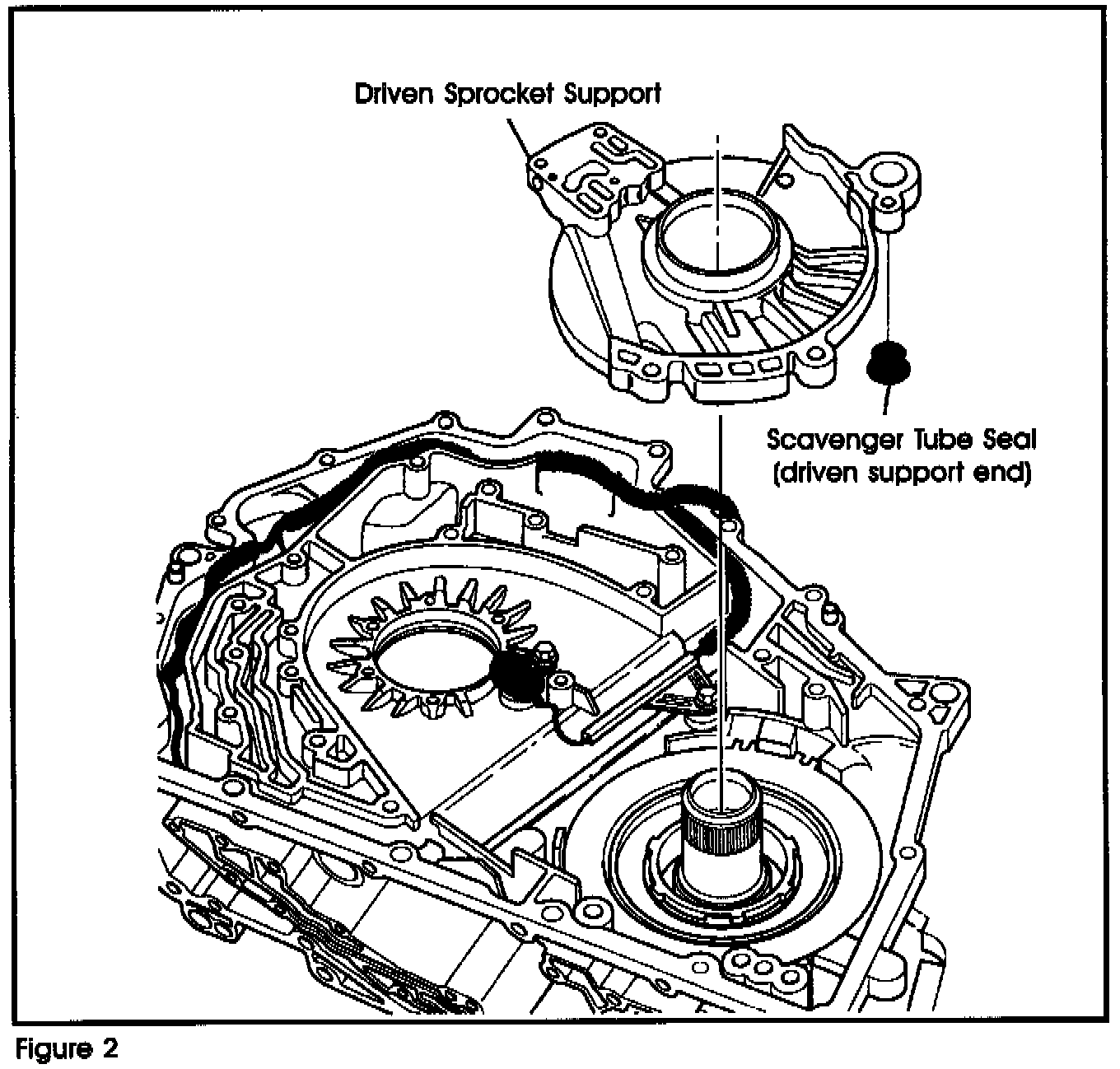 To avoid damaging the seals, make certain that the driven sprocket support scavenger tube seal is installed In the support before the support is installed into the case (figure 2). It is also advisable to apply assembly grease to the inside of the seal to aid installing the tube into the seal, since access to this area is impossible after the channel plate is installed into the case.