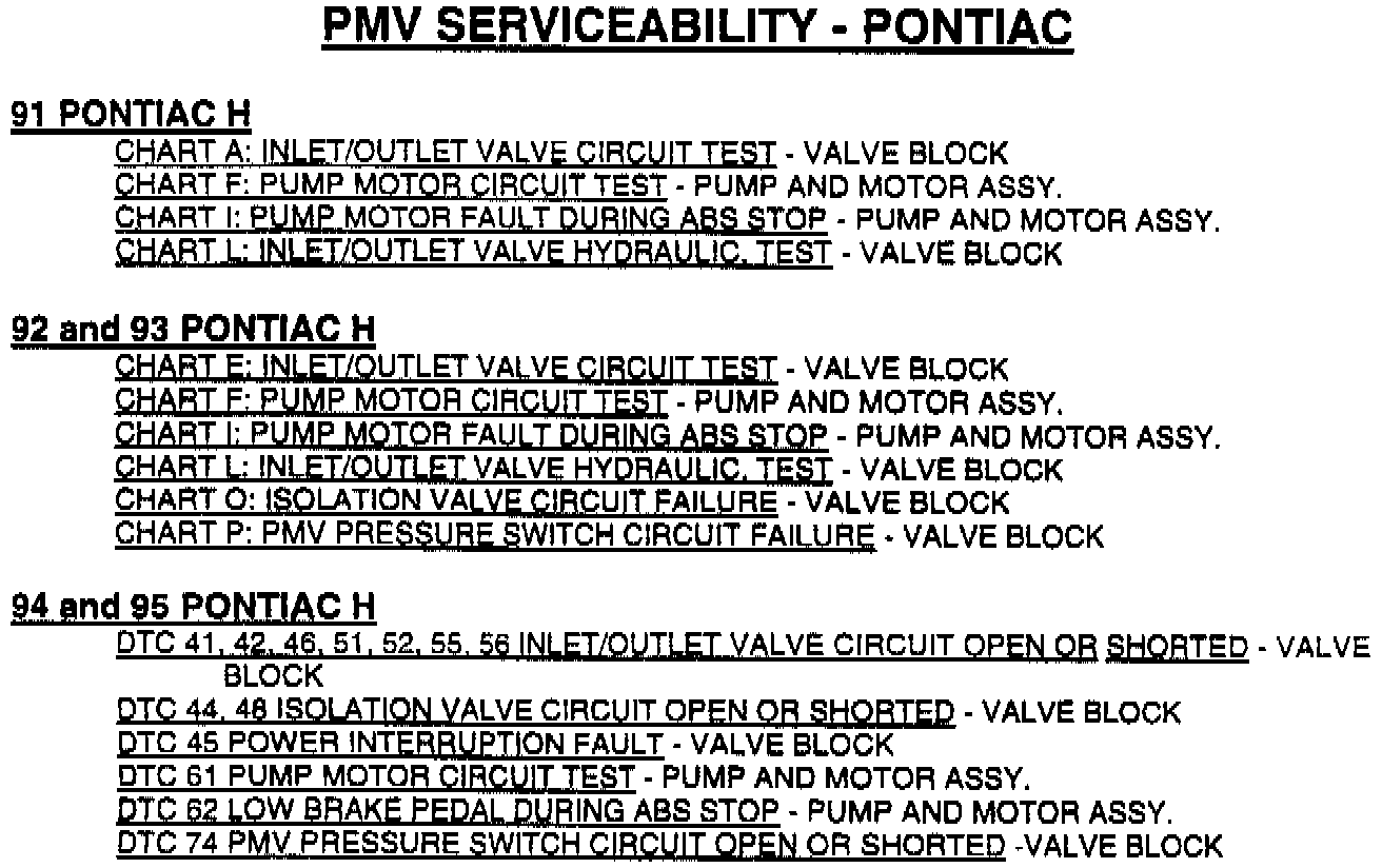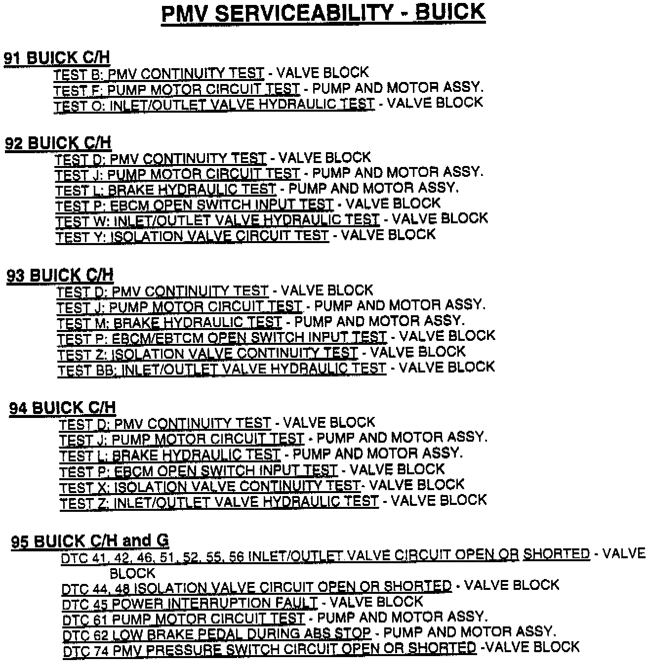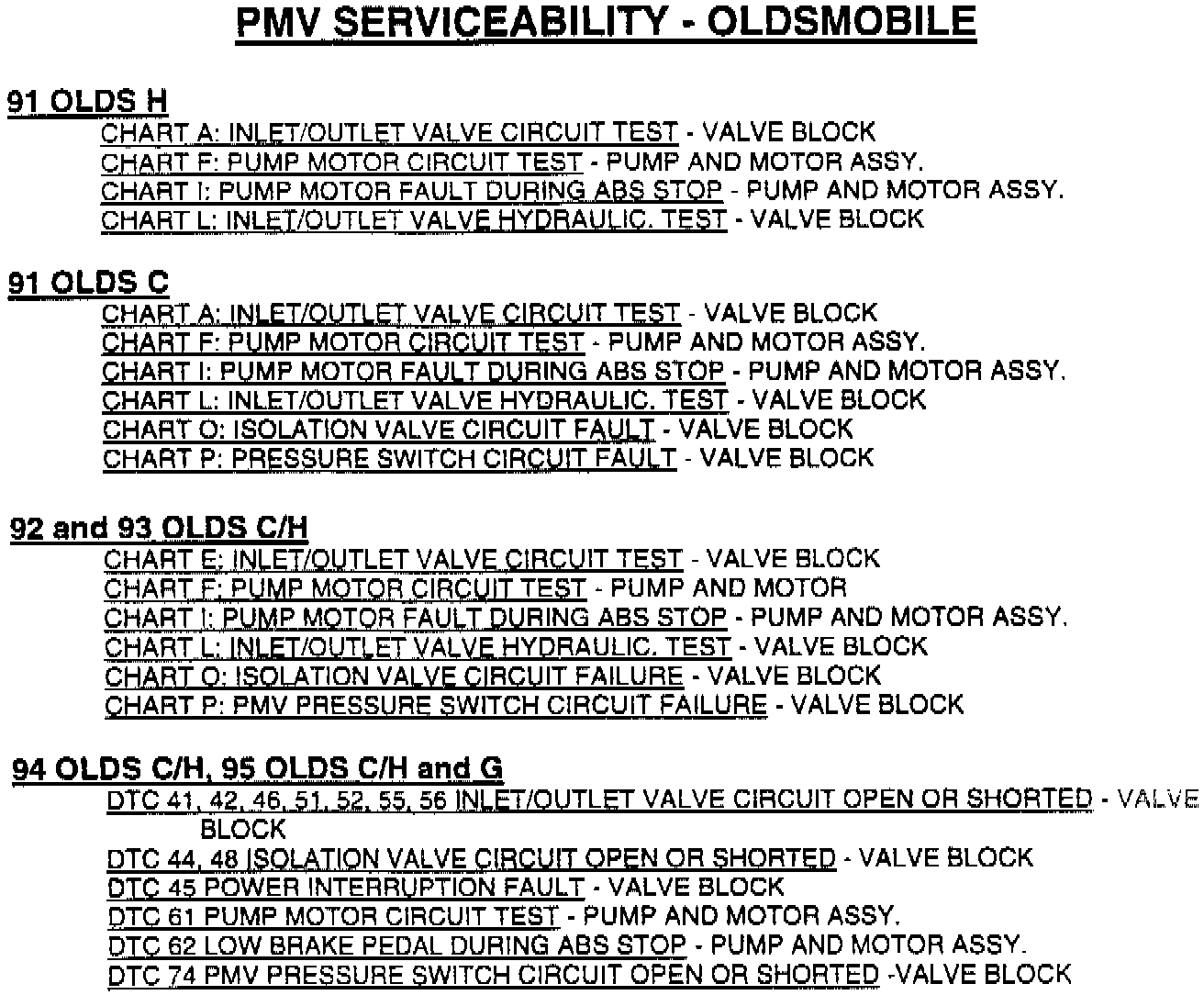The following attachments (PMV Serviceability - Buick, Cadillac, Oldsmobile, and Pontiac) list by division and year all of the tests, charts or DTC's which currently state to replace the PMV Assembly. After the title of each test, chart, or DTC is the name of the faulted unit which is to be replaced as a result of this bulletin. For example, in Test B: PMV Continuity Test of the 1991 Buick C/H, all areas where it states to replace the PMV Assembly should now state "replace the valve block only".