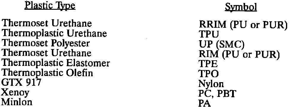 All 1993 Cadillacs have exterior parts made of various types of plastic materials that require specific procedures to obtain high quality refinishing results. Included in this bulletin is a chart listing the different types of plastic materials used on 1993 models. For best results when painting is required, determine the type of plastic material from the chart. Then follow the correct paint procedure, depending upon what painting material and equipment is available.