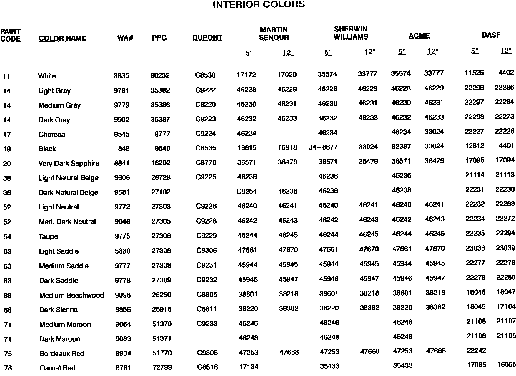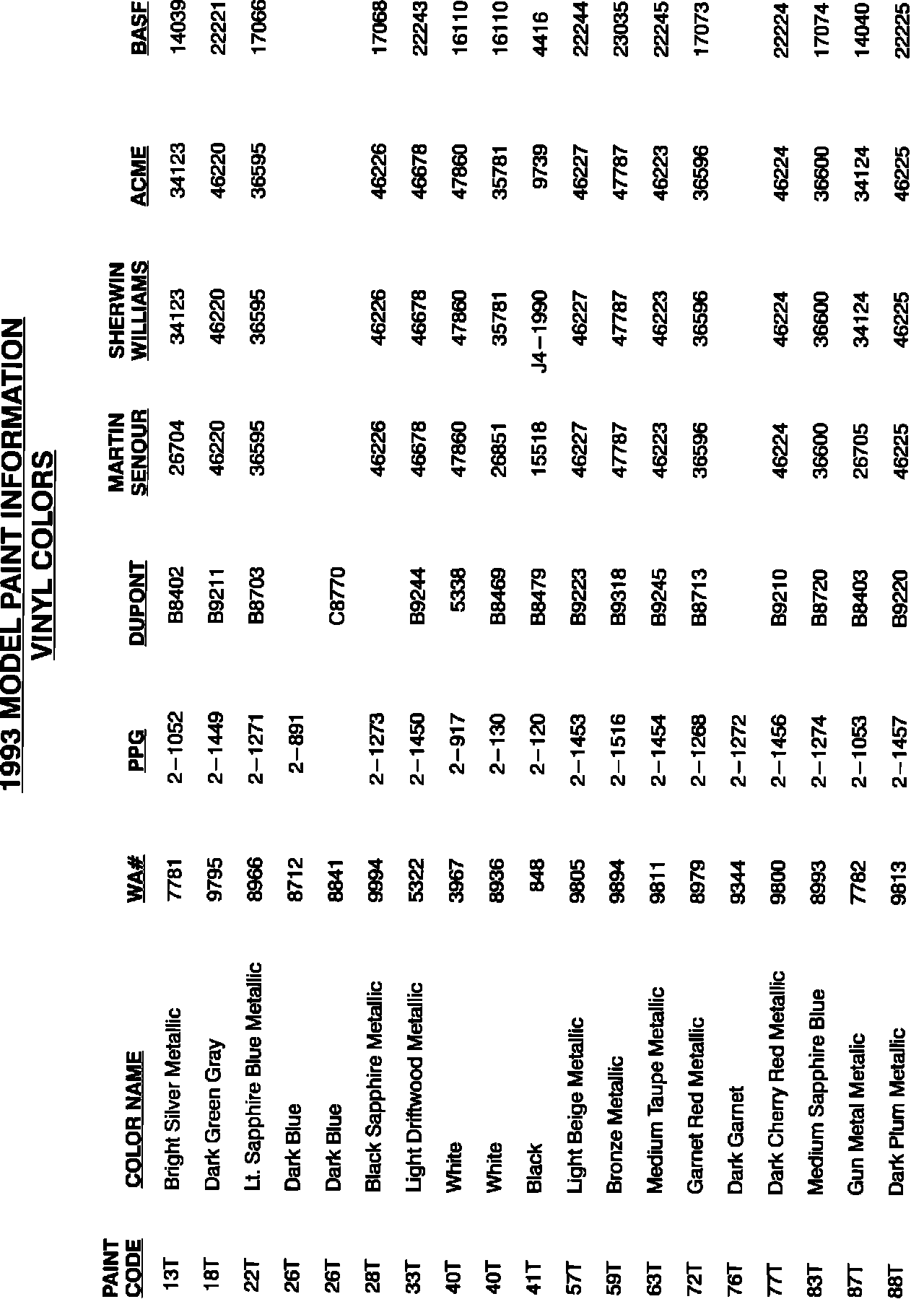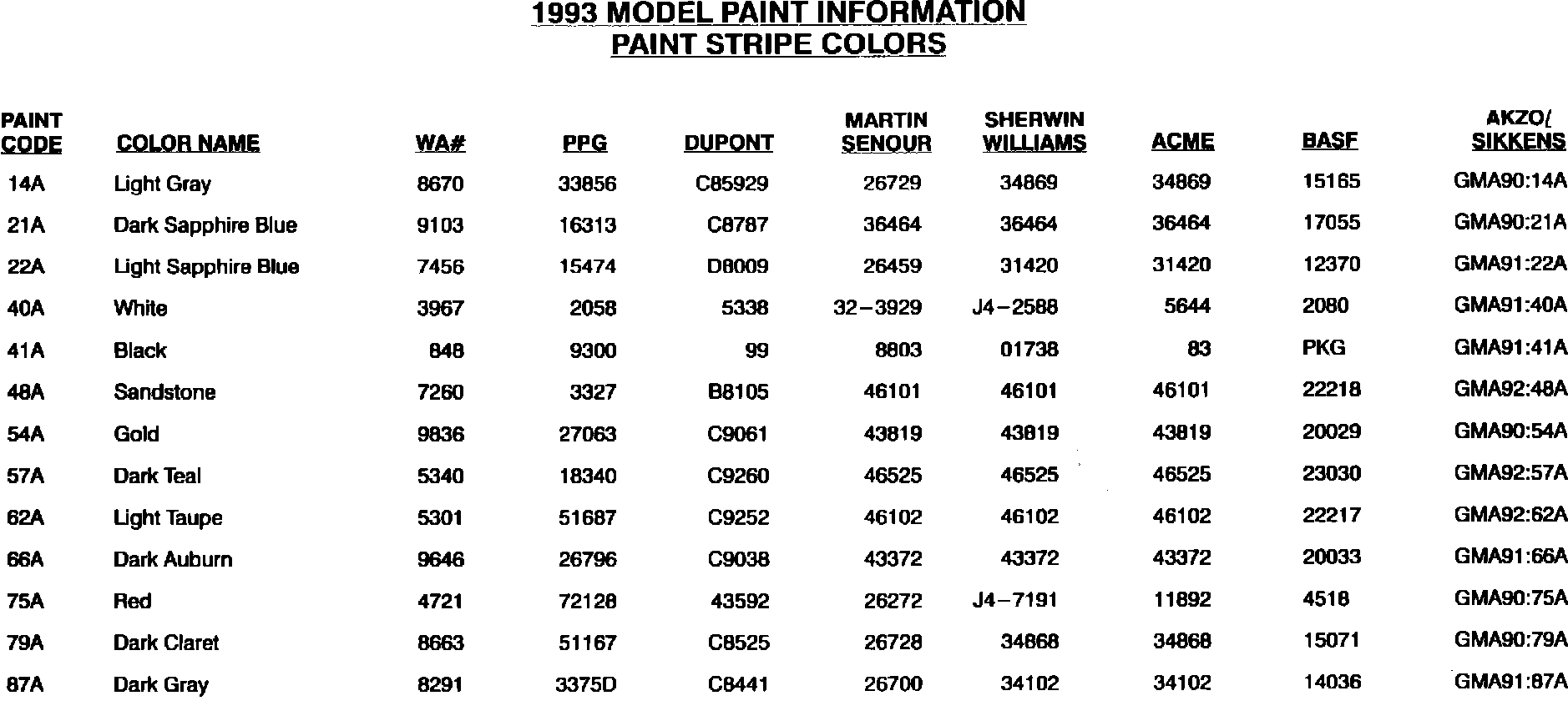 This bulletin is intended to provide a cross reference between factory paints and materials to the refinish products available in the field. It provides information about plastics identification and specific repairs required by some materials. It also provides a detailed list of the various suppliers' ordering codes for exterior, interior, vinyl roof moldings, and paint stripe colors. Paint codes listed in the bulletin are, or soon will be, available from local paint suppliers.