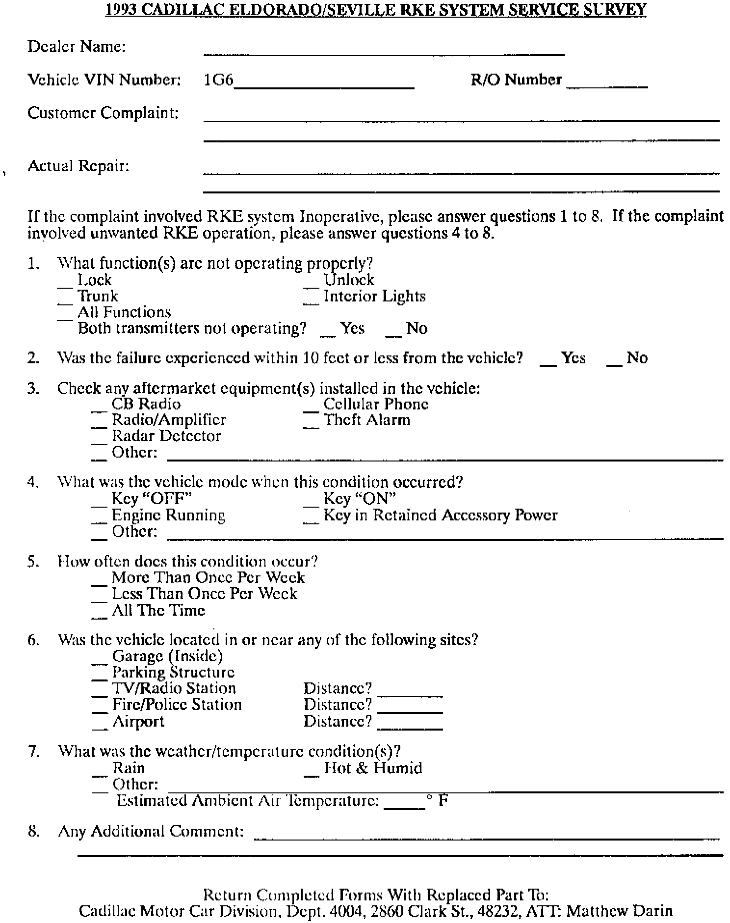 This survey should be answered first by the Service Advisor with the customer input when the car is brought in for service. The form should be then completed by the Service Technician and returned with replaced parts (if any) to Cadillac at the address on the bottom of the survey form. This program will remain in effect until the end of the 1994 model year unless a bulletin is published to terminate it.