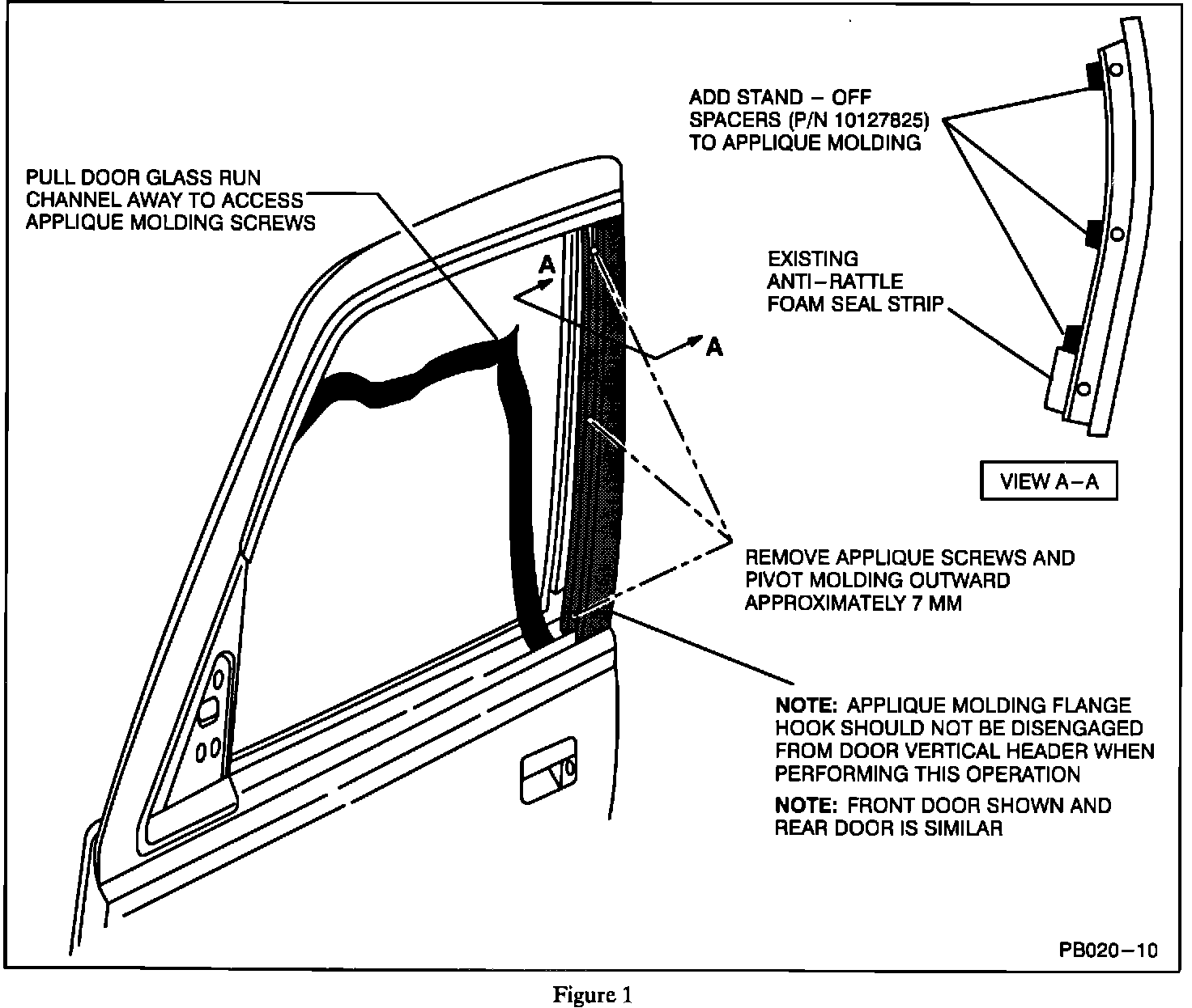 4. Install three rubber stand-off spacer blocks, P/N 10127825, to the applique molding by locating them between the molding and the door frame. This will roll the lip of the applique molding outboard and close up the gap condition between the front and rear door vertical header. Refer to Figure 1.