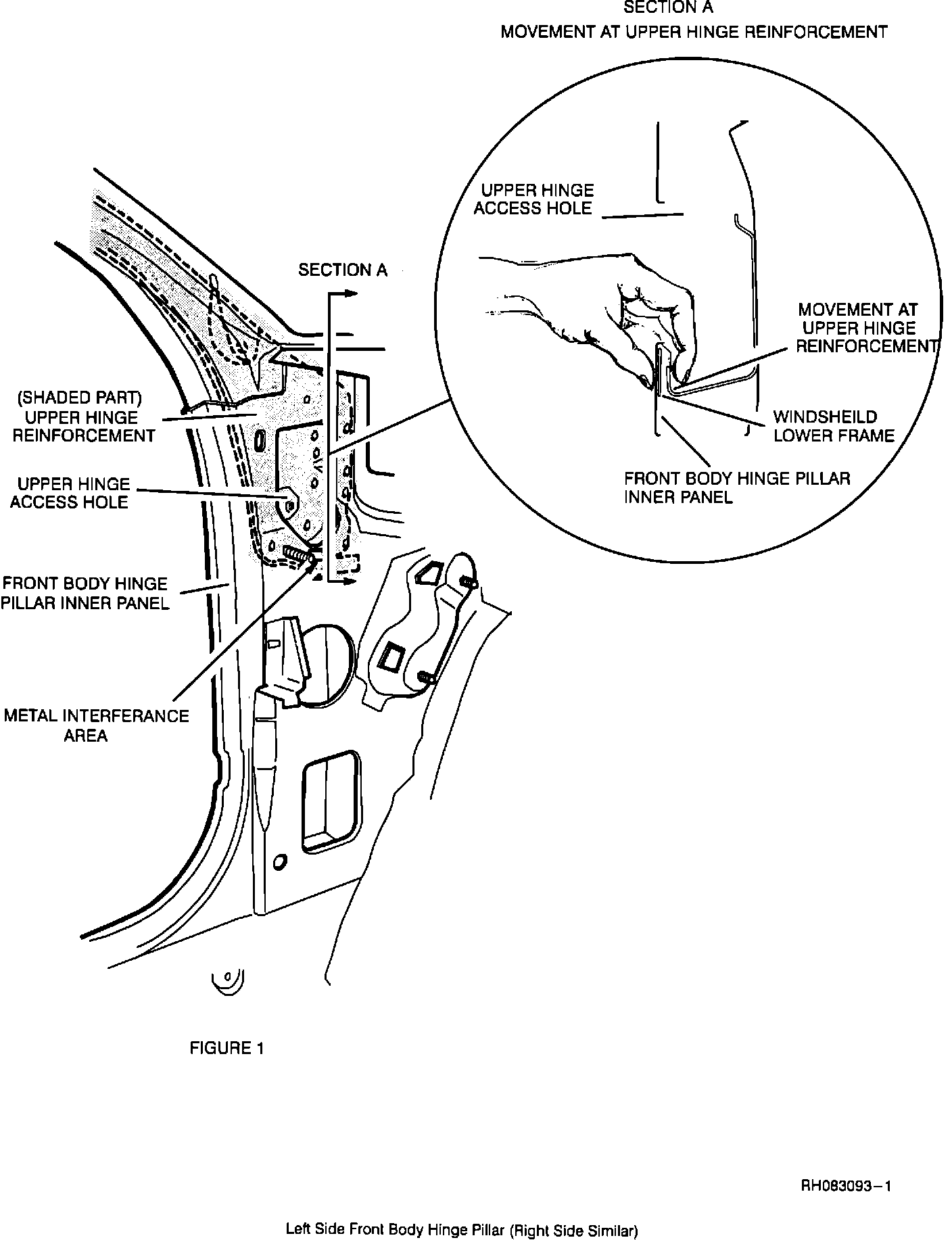 7. With your fingertips inside the access hole to the upper hinge area, rock the door against the hinge stop while feeling for movement at the upper hinge reinforcement. Refer to Figure 1, Section A. The following steps will locate the points for plug welds to eliminate the movement of the hinge reinforcement against the lower windshield frame.