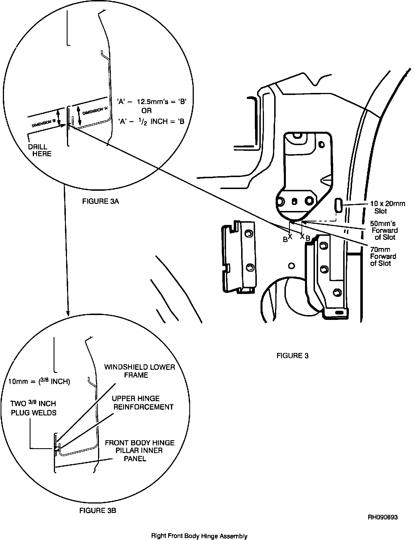 19. Plug weld these two holes starting at the upper hinge reinforcement and bridging the gap to the lower windshield frame and the front body hinge pillar inner. Refer to Figure 3B.