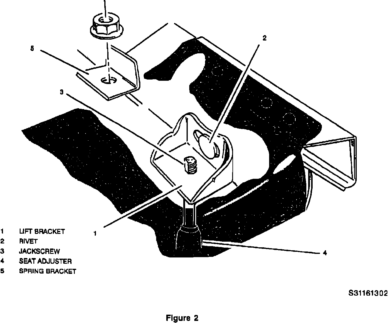 3. Place one spring bracket, P/N 16749281, on each lift bracket. Place jackscrew through hole in spring bracket for positive location. Spring bracket should fit flush to rivet head. Refer to Figure 2.