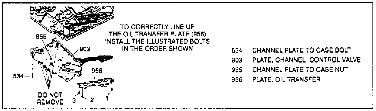 11. Place oil transfer plate over open gasket area. Hand start bolts to hold plate in place noting installation order.